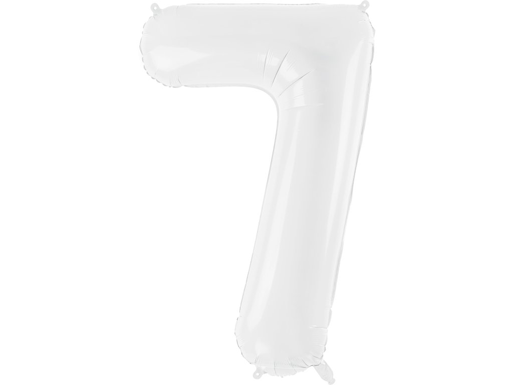 Balon foliowy numer "7" w kolorze białym, rozmiar przed napompowaniem ok. 100 cm (39''), rozmiar po napompowaniu ok. 86 cm (34''). Napompuj powietrzem lub helem.