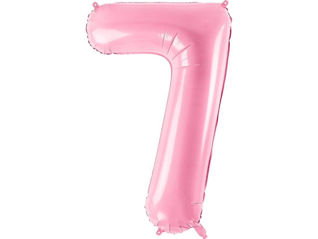 Balon z pastelowej folii numer 7, różowy, rozmiar przed napompowaniem ok. 100 cm, rozmiar po napompowaniu ok. 86 cm. Napompuj helem lub powietrzem.