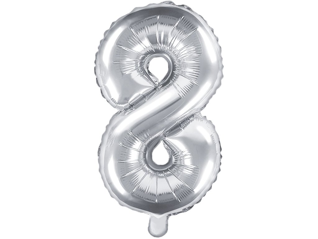 Metaliczny balon foliowy numer ''8'', srebrny, rozmiar przed napompowaniem ok. 40 cm (16''), rozmiar po napompowaniu ok. 35 cm (14'').