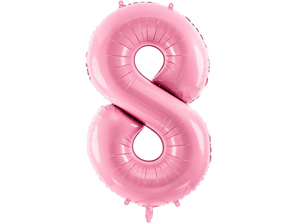 Balon z pastelowej folii numer ''8'', różowy, wielkość przed napompowaniem ok. 100 cm (39''), wielkość po napompowaniu ok. 86 cm (34''). Napompuj helem lub powietrzem.