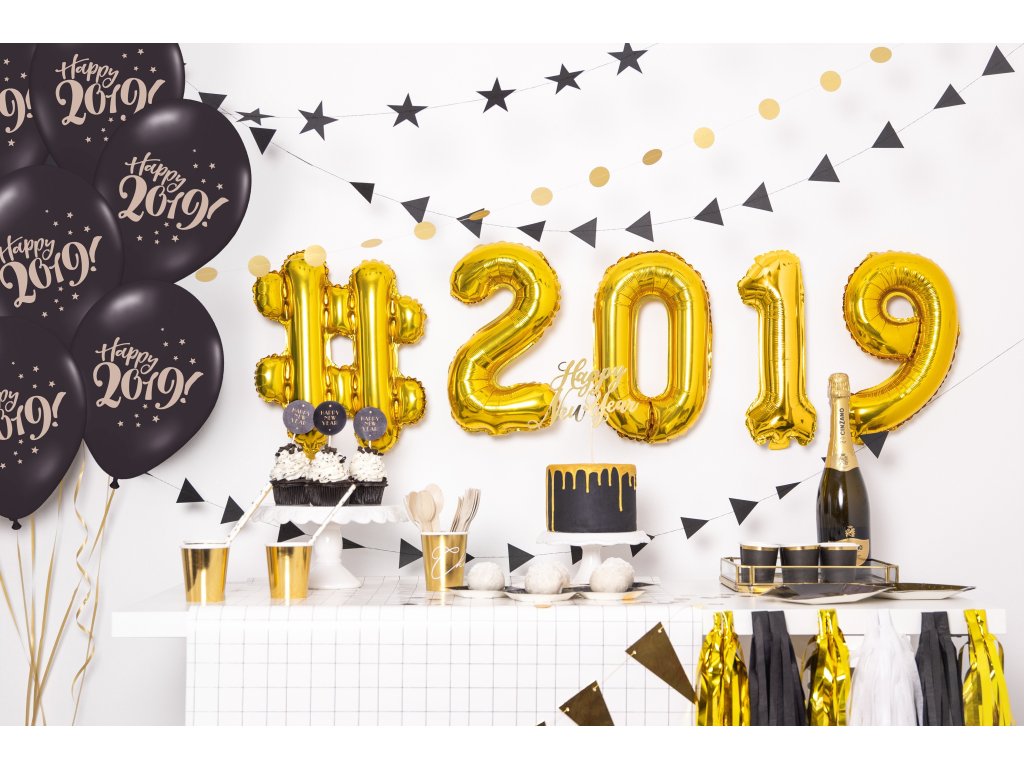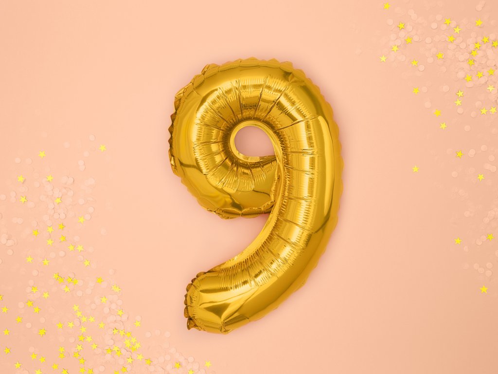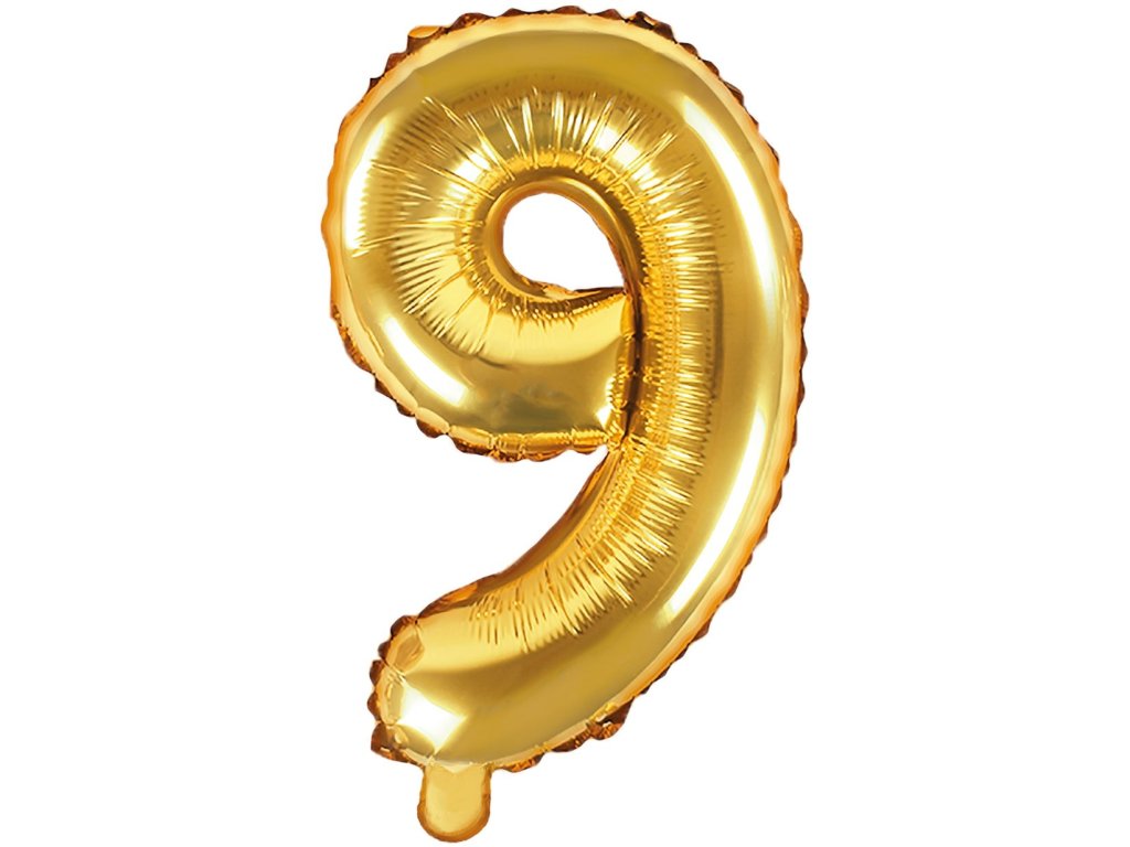 Metaliczny balon foliowy numer ''9'', złoty, rozmiar przed napompowaniem ok. 40 cm (16''), rozmiar po napompowaniu ok. 35 cm (14'').