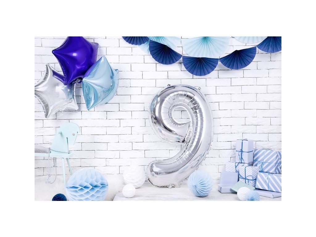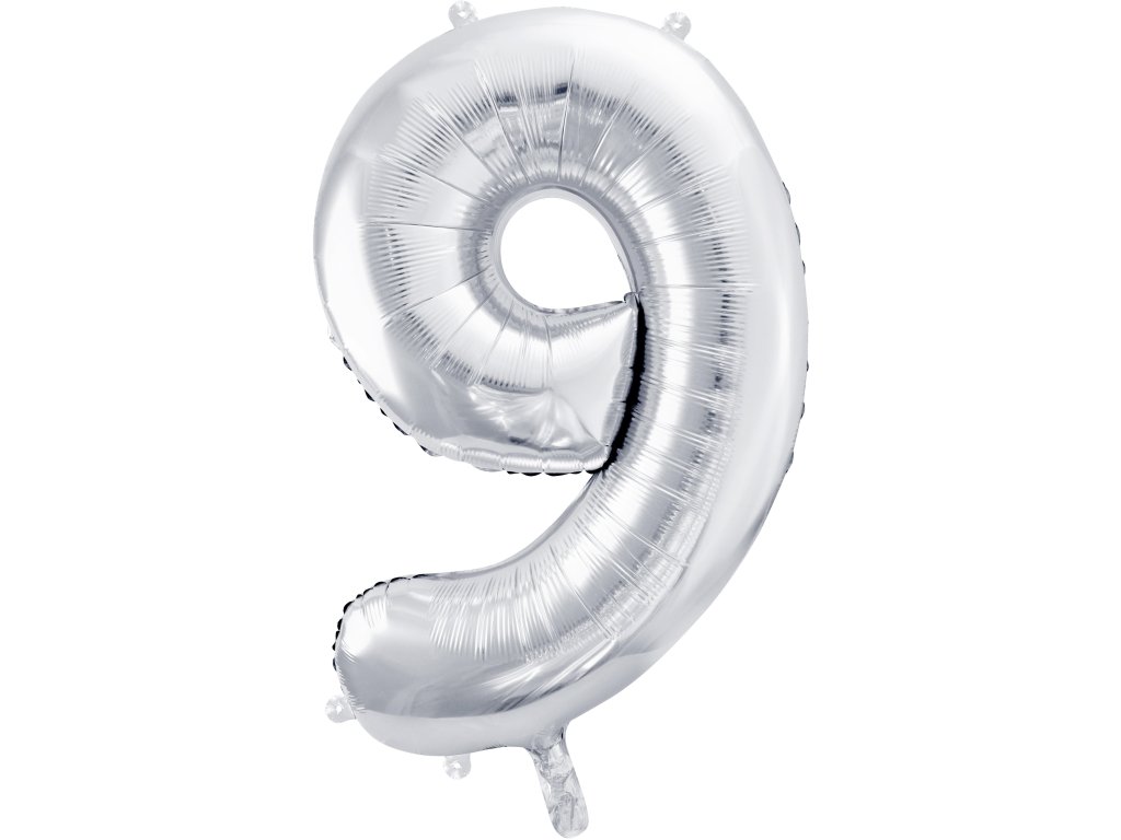 Metaliczny balon foliowy numer ''9'', srebrny, rozmiar przed napompowaniem ok. 100 cm (39''), rozmiar po napompowaniu ok. 86 cm (34''). Napompuj helem lub powietrzem.
