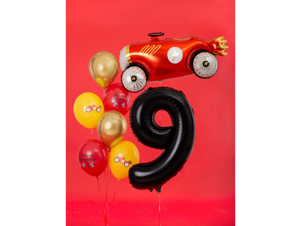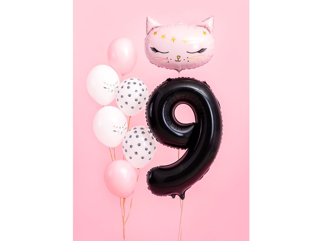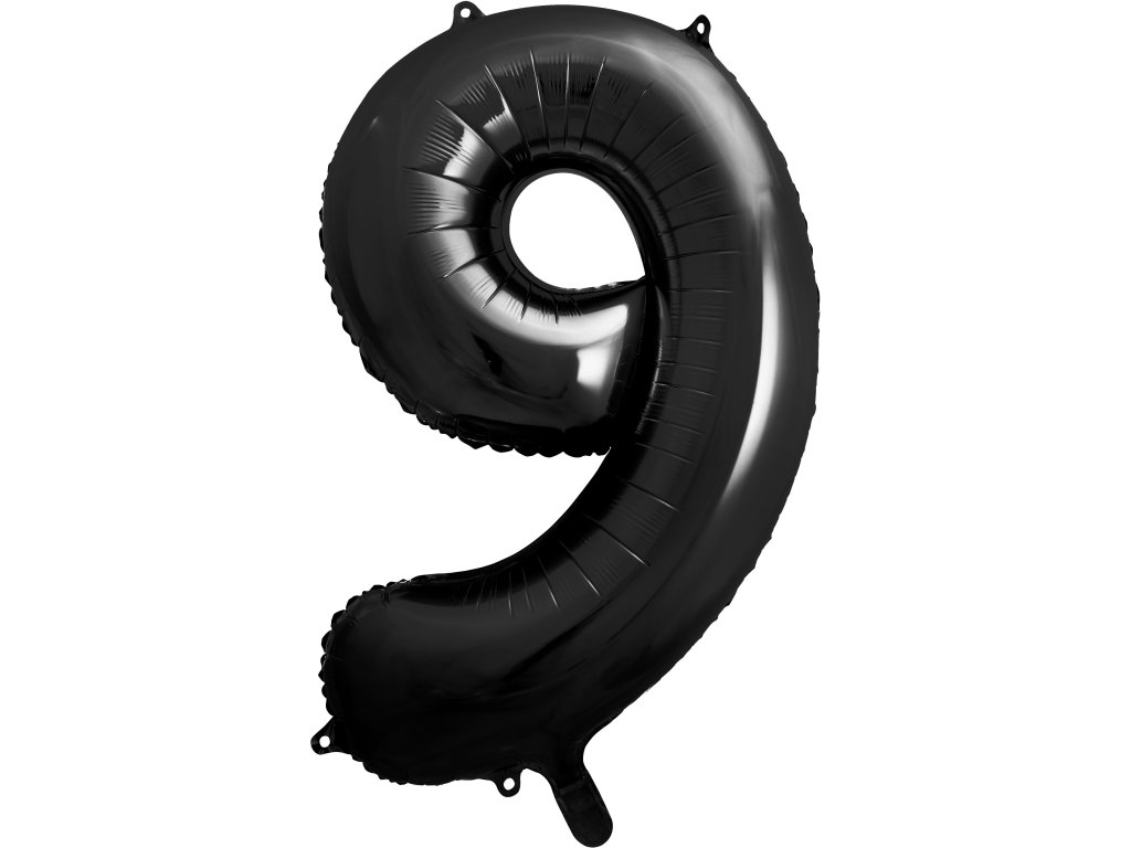 Balon z metalizowanej folii numer ''9'', w kolorze czarnym, rozmiar przed napompowaniem ok. 100 cm (39''), rozmiar po napompowaniu ok. 86 cm (34''). Napompuj helem lub powietrzem.
