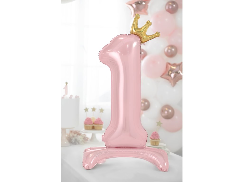 Stojący balon z metalicznej folii numer "1" w jasnoróżowym kolorze z koroną w złotym kolorze, wielkość przed napompowaniem ok. 103 cm (40,5''), wielkość po napompowaniu 84 cm (33''). Napompuj powietrzem.