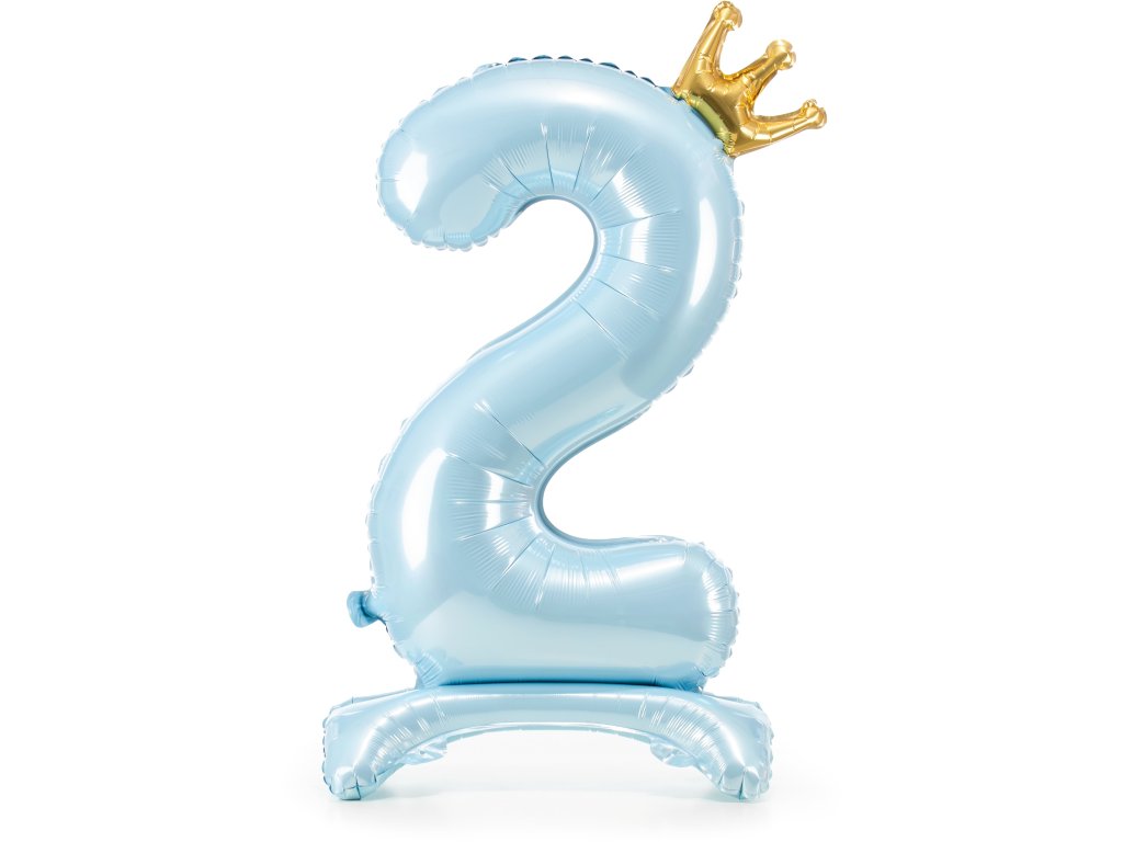 Stojący balon foliowy numer "2" w kolorze błękitu nieba z koroną w kolorze złotym, rozmiar przed napompowaniem ok. 103 cm (40,5''), rozmiar po napompowaniu 84 cm (33''). Napompuj powietrzem.