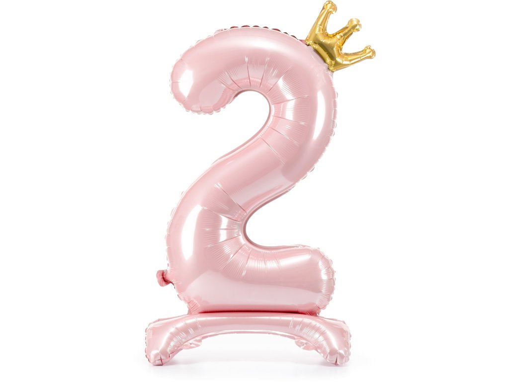 Stojący balon z metalizowanej folii numer "2" w jasnoróżowym kolorze z koroną w kolorze złotym, wielkość przed napompowaniem ok. 103 cm (40,5''), wielkość po napompowaniu 84 cm (33''). Napompuj powietrzem.