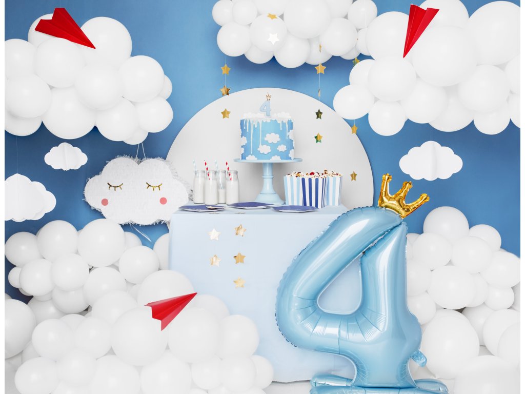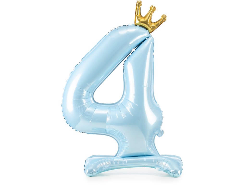 Balon stojący z metalizowanej folii numer "4" w niebieskim kolorze z koroną w kolorze złotym, wielkość przed napompowaniem ok. 103 cm (40,5''), wielkość po napompowaniu 84 cm (33''). Napompuj powietrzem.