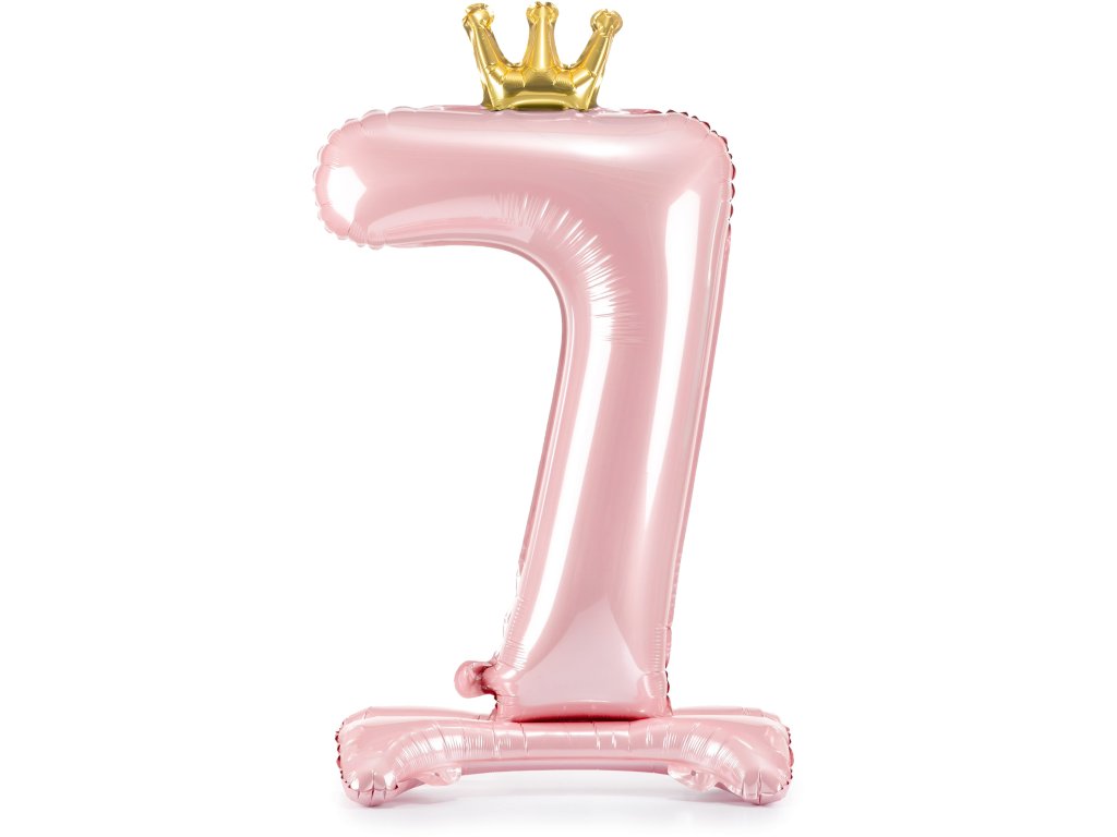 Balon stojący z metalicznej folii numer "7" w jasnoróżowym kolorze z koroną w kolorze złotym, wielkość przed napompowaniem ok. 103 cm (40,5''), wielkość po napompowaniu 84 cm (33''). Napompuj powietrzem.