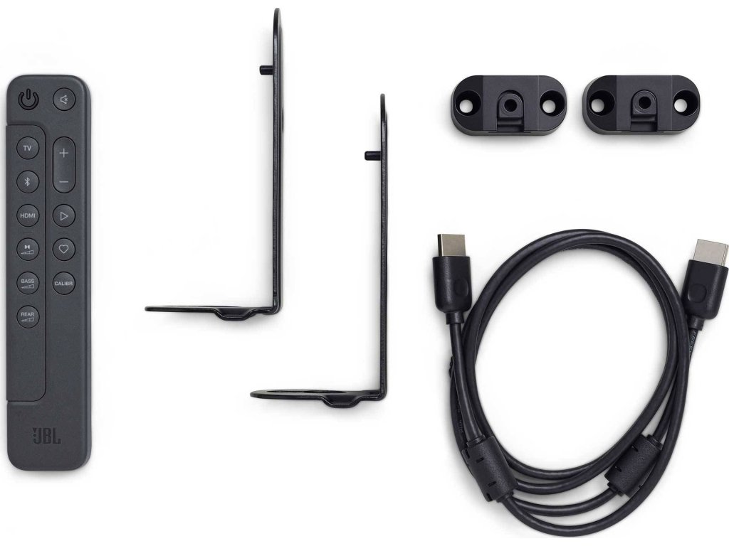 - 2 x uchwyt ścienny w kształcie litery L (do głównego soundbara) + 2 x uchwyt ścienny w kształcie litery U (do głośników przestrzennych) ze śrubami