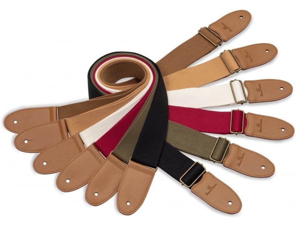 Bawełniany pasek z końcówkami z wysokiej jakości skóry. Oczywista jest regulowana długość, do której służy mosiężna klamra.