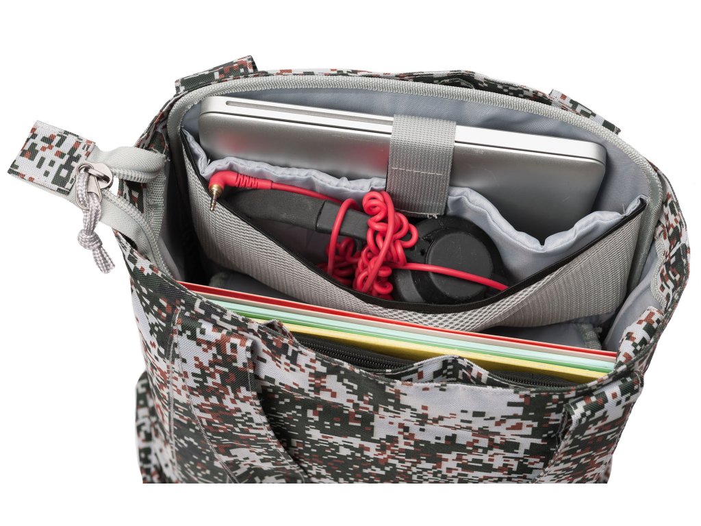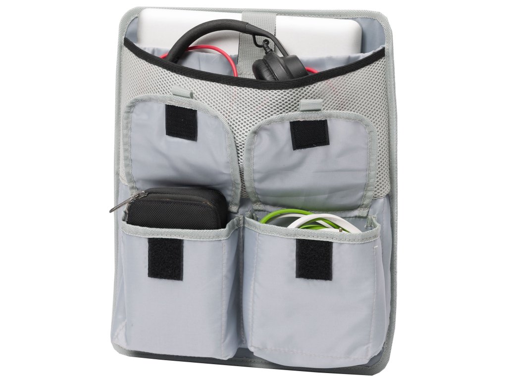 - Wyjmowany, wyściełany panel na laptopa (do 15 cali) z oddzielnymi kieszeniami do przechowywania słuchawek, karty dźwiękowej, kabli itp.