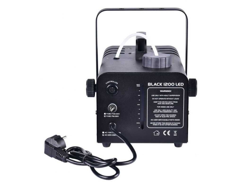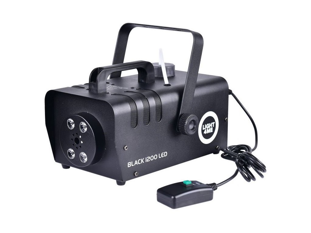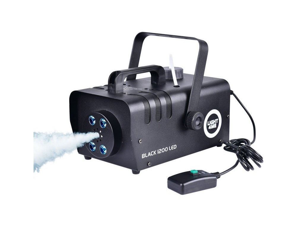 LIGHT4ME BLACK 1200 LED to profesjonalny i bardzo wydajny generator dymu (wytwornica mgły) o mocy 1200 watów i wysokiej wydajności, wyposażony w system sześciu diod LED o mocy 1 W, które skutecznie podkreślają wydobywającą się parę. Maszynę można obsługiwać za pomocą przewodowego i bezprzewodowego pilota zdalnego sterowania. Działa doskonale na małych scenach muzycznych i teatralnych, w klubach tanecznych i dyskotekach, a także podczas różnego rodzaju imprez okolicznościowych. Wytwornica mgły jest gotowa do pracy już po 4 minutach, a zastosowanie nowoczesnej technologii chroni element grzejny przed zatkaniem. Funkcja elektronicznego termostatu umożliwia korzystanie z wytwornicy mgły w dowolnym momencie po pierwszym nagrzaniu.
