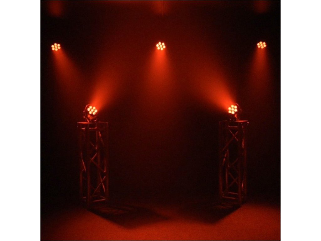 Efekt świetlny LED PAR firmy LIGHT4ME. Black PAR 7 x 10 W to punktowy efekt świetlny z prostym sterowaniem i korzystną kategorią cenową. Urządzenie jest wyposażone w 7 x 10 W diod LED (czerwona, zielona, niebieska, biała i pomarańczowa). Światło zapewnia efekt zmiany kolorów, ściemniania kolorów, tryb automatyczny, sterowanie dźwiękiem, statyczne kolory i stroboskop. Światło umożliwia umieszczenie na równej powierzchni i umieszczenie na nośnikach dzięki uniwersalnej konsoli montażowej.