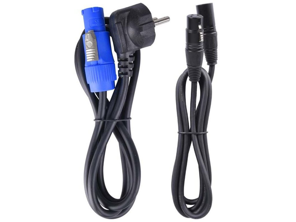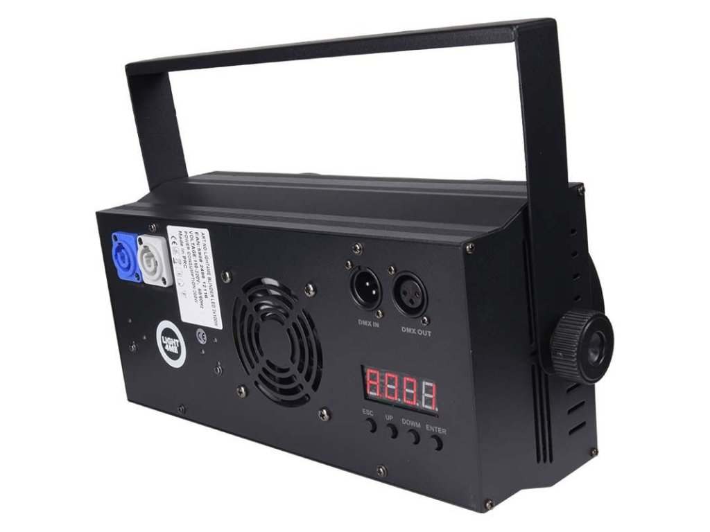Light4Me Blinder LED 2x100W posiada solidną, metalową obudowę ze śrubowanym uchwytem montażowym, dzięki któremu reflektor można postawić na ziemi pod odpowiednim kątem do oświetlanej powierzchni lub zamontować na kratownicach i rampach oświetleniowych. Z tyłu znajdują się gniazda powercon (w tym wyjście powercon, które umożliwia przesyłanie napięcia bezpośrednio z urządzenia do urządzenia), 3-pinowe gniazda XLR do sterowania reflektorem za pomocą protokołu DMX oraz panel sterowania składający się z cyfrowego wyświetlacza z 4 przyciskami. Za ich pomocą możemy wybrać jeden z kilku dostępnych trybów pracy urządzenia: