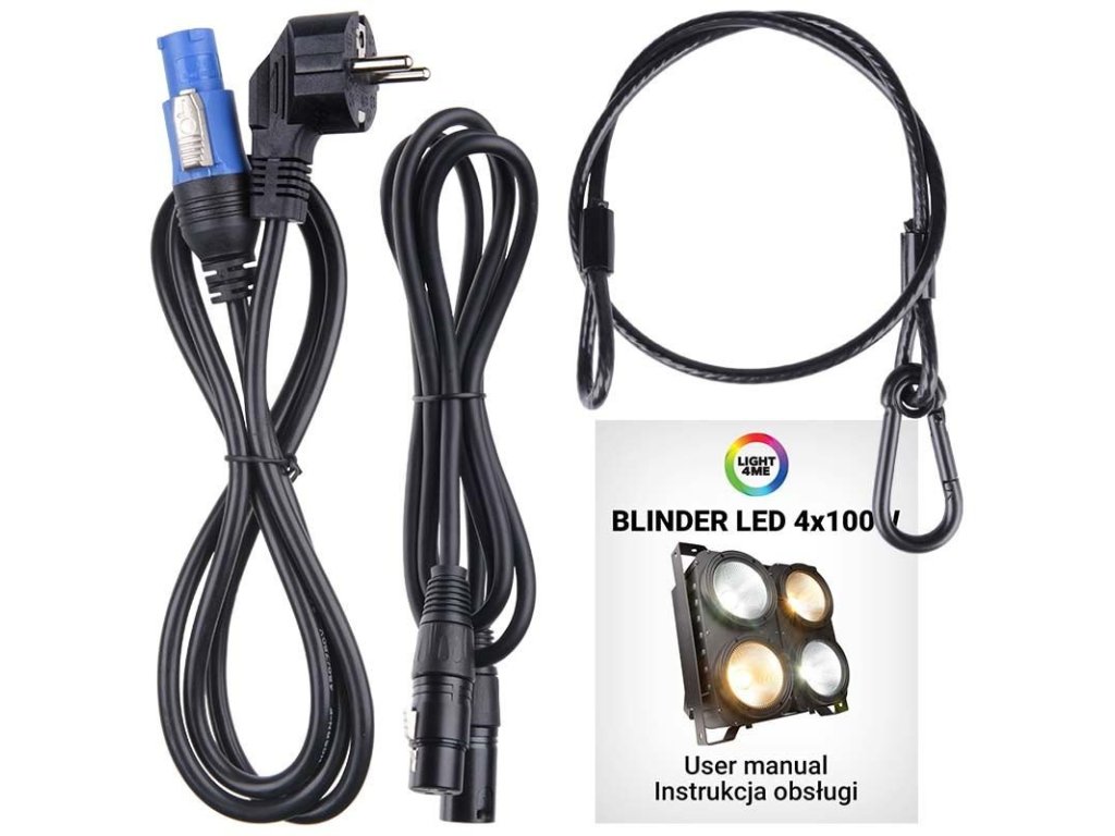 Light4Me Blinder LED 4x100W ma 4 bardzo wydajne, 100W diody LED pracujące z ciepłym białym światłem ze spektrum przesuniętym do żółtego i zimnym białym światłem z niebieskim spektrum. Temperaturę barwy światła można płynnie regulować od ciepłej, przez neutralną, aż po zimną. Wszystkie cztery LED mogą świecić niezależnie, pracować nieprzerwanie lub produkować stroboskopowe efekty. Intensywność światła można łatwo kontrolować za pomocą liniowego ściemniacza – od delikatnego podświetlenia aż po intensywny blask. Zasięg roboczy reflektora wynosi od 10 do nawet 30 metrów, dzięki czemu świetnie nadaje się do małych i dużych scen, jak również do klubów tanecznych i dyskotek.