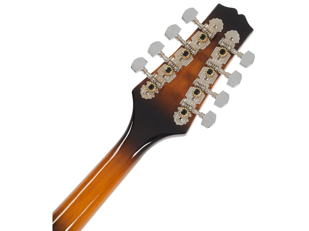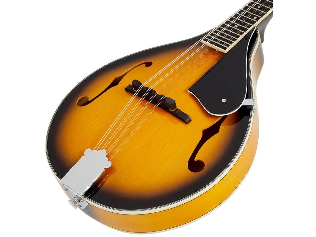 Mandolina jest wyposażona w chromowane mechanizmy stroikowe zapewniające precyzyjne i stabilne strojenie oraz solidny strunnik do mocowania strun. Atrakcyjny wizualnie wygląd dopełnia biała lamówka obwodowa i praktyczny czarny pickguard chroniący przednią płytę przed zarysowaniami.