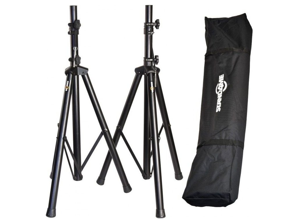Cały komplet zawiera zestaw dwóch statywów oraz solidne etui, które chroni statywy przed zarysowaniami i służy do ich przechowywania i transportu. Oba statywy świetnie nadają się do instalacji stałych, a dzięki torbie transportowej idealnie sprawdzą się również w zastosowaniach mobilnych. Cenią go soliści, zespoły muzyczne, DJ-e oraz agencje eventowe.