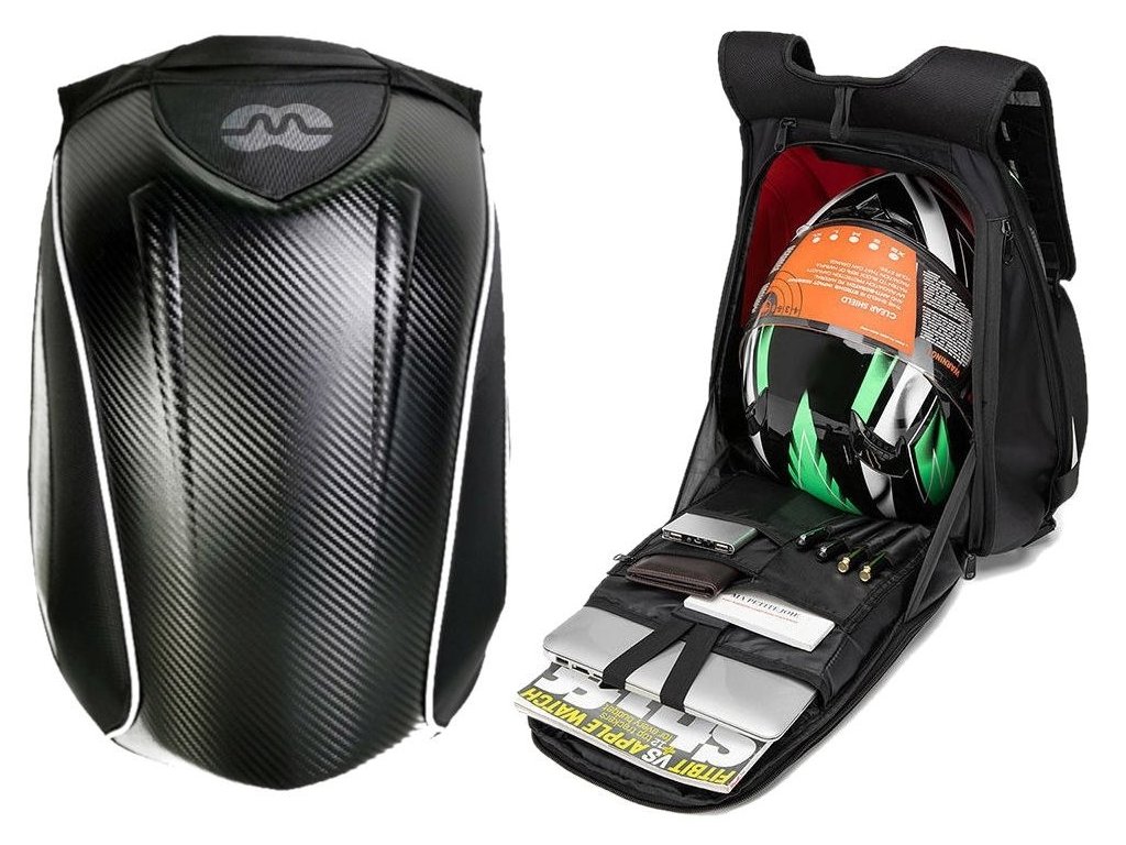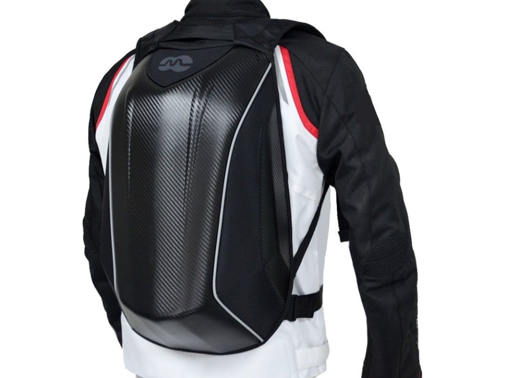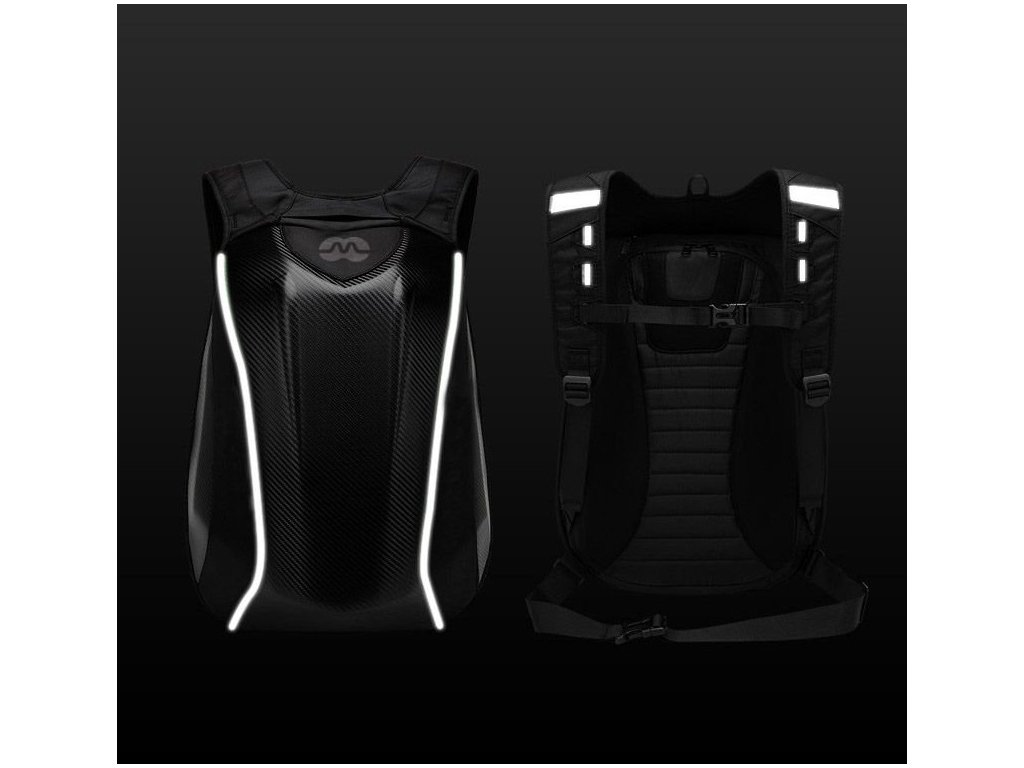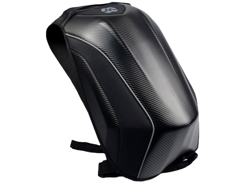 Aerodynamicznie ukształtowany plecak odpowiedni dla motocyklistów i bikerów, posiadający wodoodporną powierzchnię, przegrodę na laptopa o wielkości do 14" oraz dużą, przestronną kieszeń o pojemności 35/45 litrów na kask motocyklowy. Ergonomicznie ukształtowana konstrukcja doskonale przylega do pleców i bardzo skutecznie radzi sobie z uderzeniami wiatru podczas szybkiej jazdy. Wielofunkcyjny plecak wykonany jest z połączenia wodoodpornej tkaniny i karbonu, a także oferuje specjalne otwory na słuchawki lub bidon. Plecak jest wysoce odporny na zabrudzenia, a dzięki gładkiej karbonowej powierzchni jest bardzo łatwy w czyszczeniu.