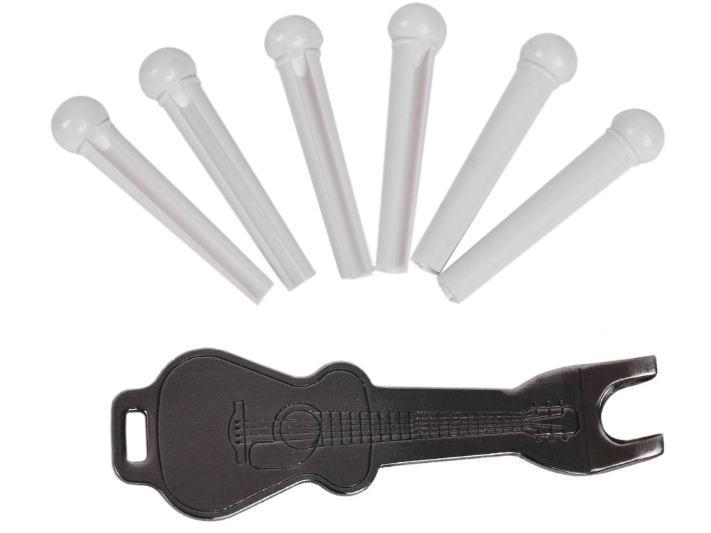 Zestaw sześciu zapasowych kołków do mostka gitary akustycznej. W zestawie klucz do ich usuwania.