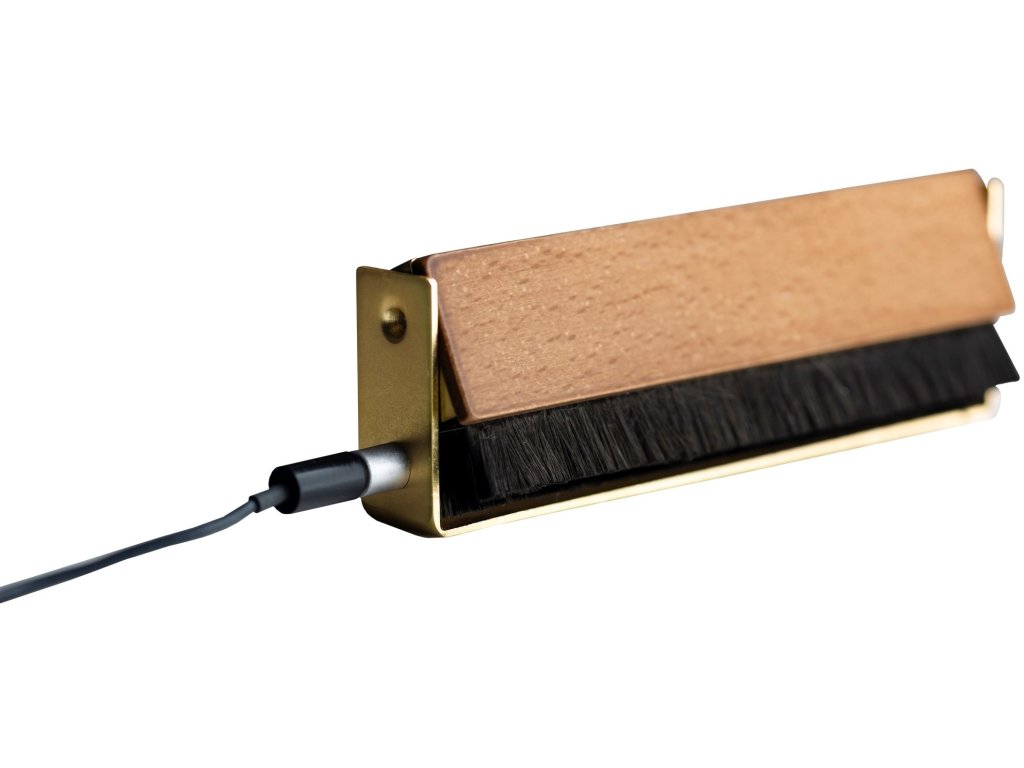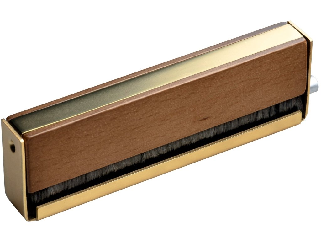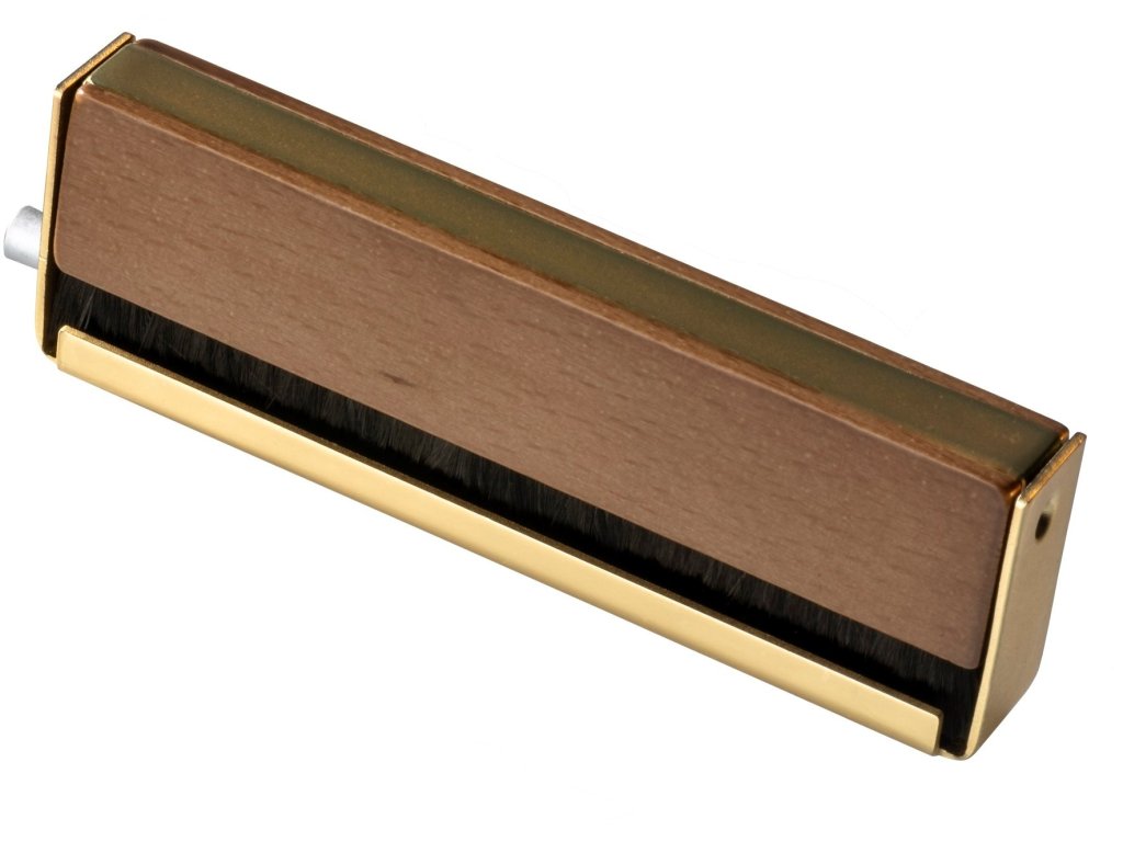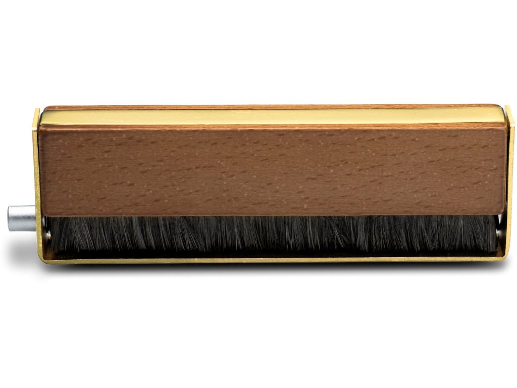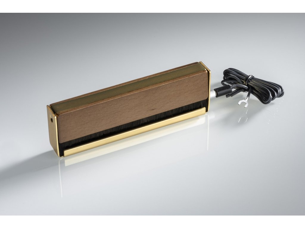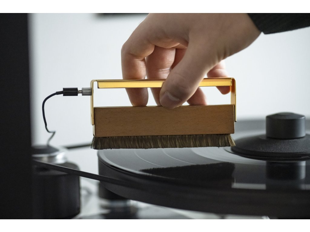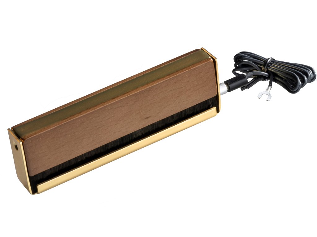 Do rękojeści z kombinacji drewna i metalu podłącza się przewód uziemiający, który na drugim końcu podłącza się do zacisku uziemiającego przedwzmacniacza gramofonowego, a płyta gramofonowa podczas czyszczenia staje się praktycznie antystatyczna. Przewód uziemiający jest częścią zestawu, a rękojeść, oprócz tego, że działa jako uziemienie, zapewnia również pewny i wygodny chwyt. Przewodność tysięcy delikatnych włosków pomaga rozładować ładunek statyczny, eliminując trzaski podczas odtwarzania.