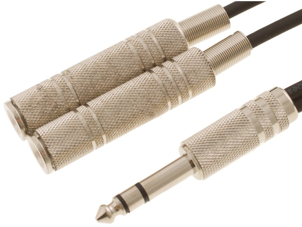 Kabel połączeniowy z wtykiem stereo 6.3 mm i dwoma gniazdami mono 6.3 mm, kabel ekranowany.