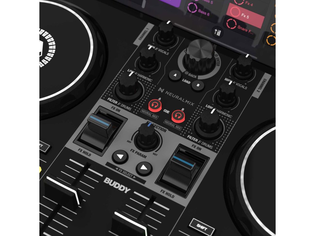 Buddy to kompaktowy, dwukanałowy kontroler DJ marki Reloop, odpowiedni zarówno dla początkujących, jak i zaawansowanych DJ-ów, do sesji studyjnych lub występów na żywo. Kontroler można podłączyć do komputera PC, laptopa, tabletu lub smartfona z systemem iOS lub Android. Buddy jest kompatybilny z większością aplikacji i programów DJ dostępnych na rynku. Posiada intuicyjny panel sterowania z podświetlanymi padami, dotykowymi faderami FX i wydajnymi kołami Jog. Nowością jest tryb Neural Mix do izolowania rytmów, instrumentów i wokalu wybranej piosenki. Inne funkcje to np.: looper, sampler, slicer, hot cue, touch FX i inne.