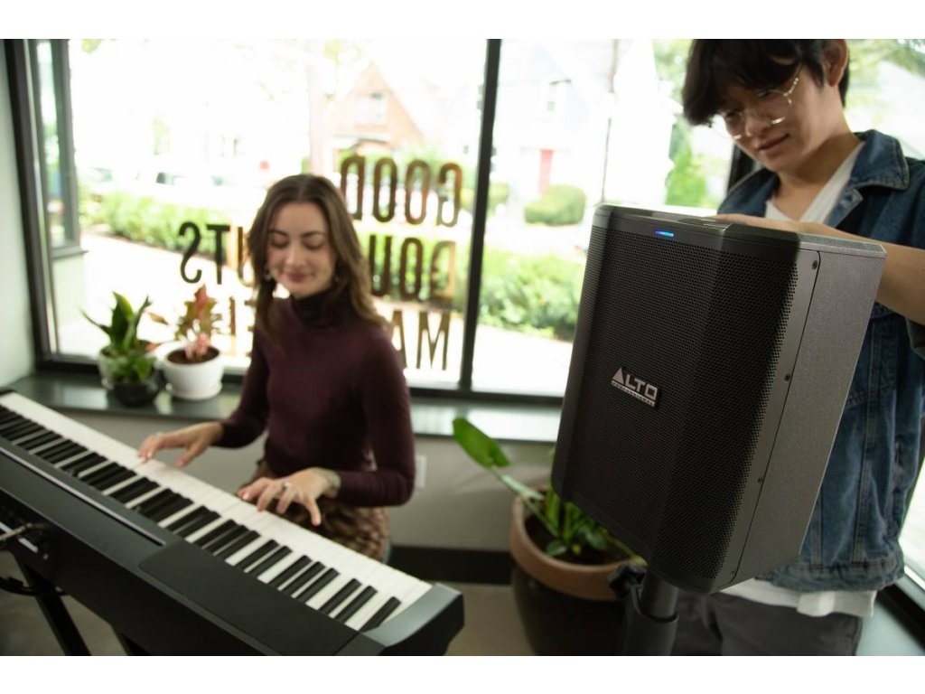 Dodaj swoim wokalom lub gitarom dodatkowego blasku i elegancji dzięki wbudowanemu procesorowi Alesis FX, zapewniającemu najwyższej klasy dźwięk nawet w najbardziej kameralnych warunkach, uzupełnionemu dedykowanymi pokrętłami do niezależnej regulacji głośności. Busker jest wyposażony w interfejs Bluetooth na kanale 3 do bezprzewodowego przesyłania strumieniowego podkładów muzycznych z Twojego inteligentnego urządzenia. Odtwarzaj rytmiczne utwory podczas jamowania lub eksperymentuj z ulubioną aplikacją metronomu, aby rozluźnić palce przed występem. Gdy masz już pod ręką inteligentne urządzenie, otwórz bezpłatną aplikację Alto dla iOS i Android i szybko załaduj ulubione ustawienia konfiguracji. Dzięki wejściu AUX 1/8 możesz podłączyć swoje ulubione źródła dźwięku, takie jak groove boxy lub automatyczny perkusista, i utrzymywać rytm za pomocą jednego prostego połączenia.
