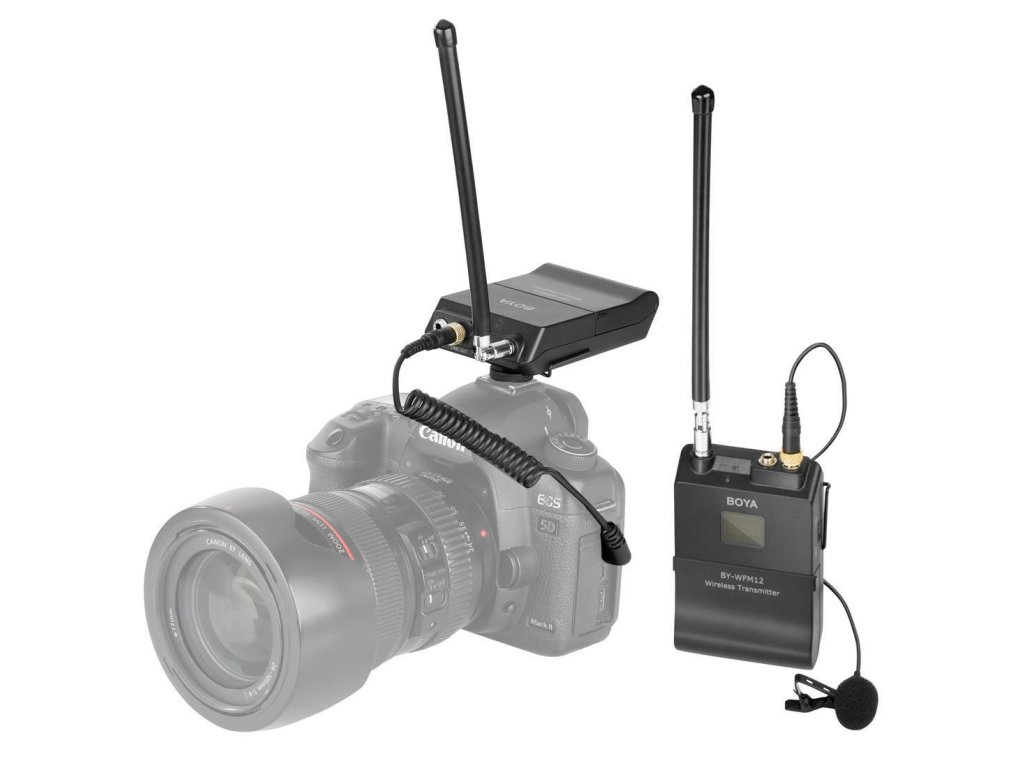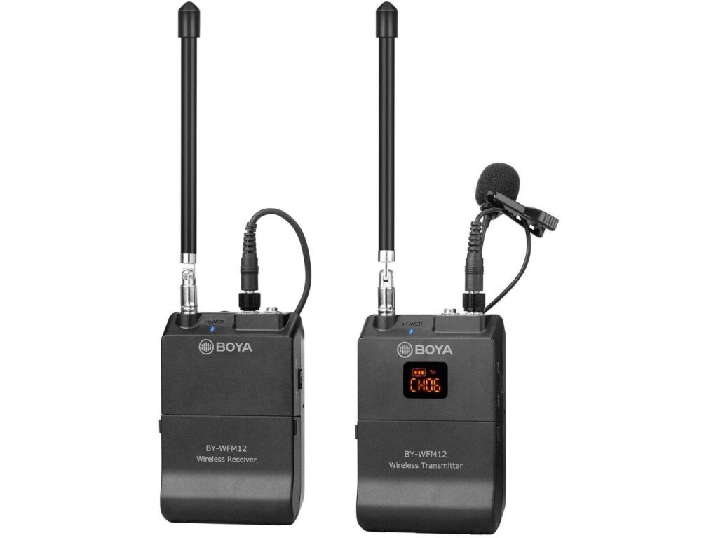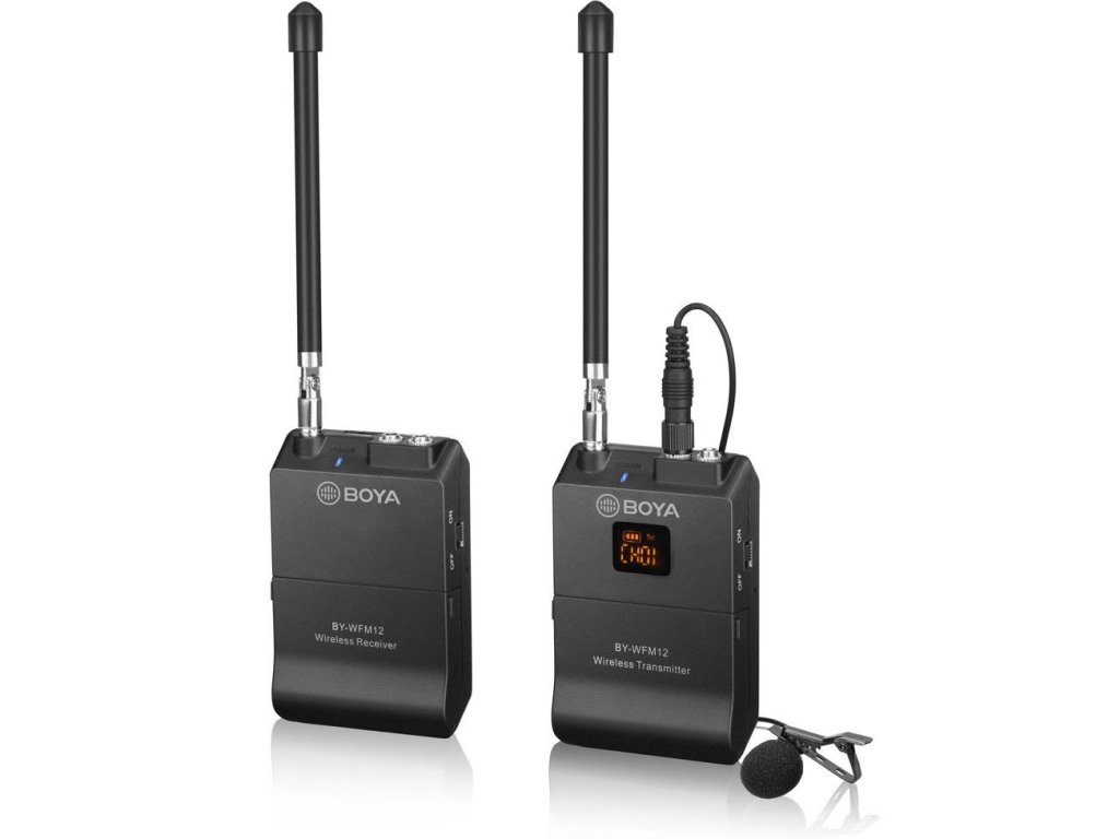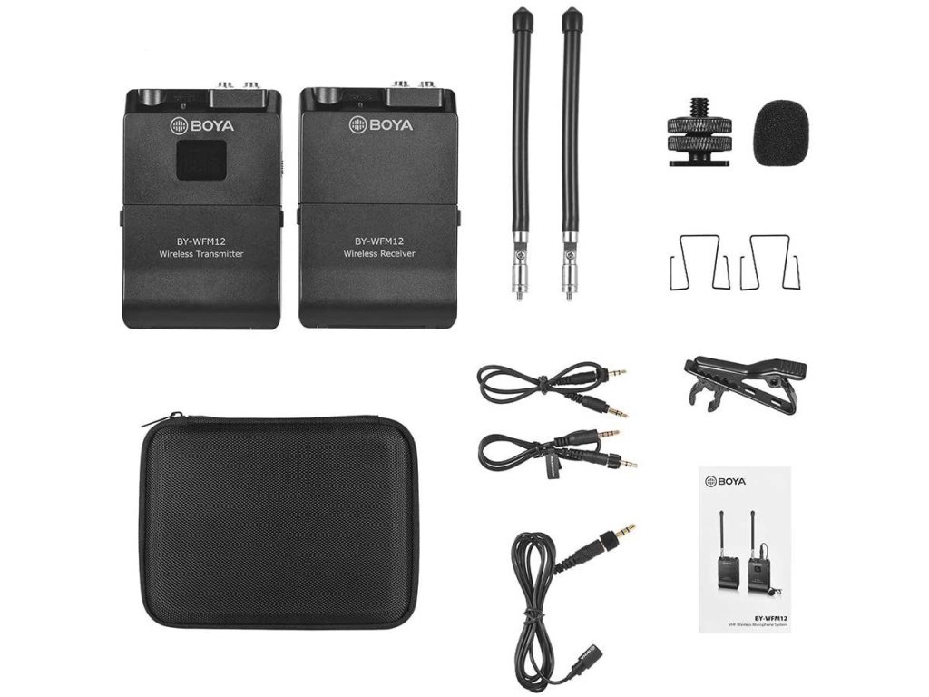 Bezprzewodowy mikrofonowy 12-kanałowy system VHF Boya BY-WFM12 składa się z nadajnika, odbiornika i mikrofonu dookólnego, który odbiera dźwięk z taką samą jakością i zyskiem ze wszystkich stron, dzięki czemu nagrywany głos brzmi czysto i naturalnie. System jest bardzo kompaktowy, prosty w obsłudze i zapewnia wysoką jakość dźwięku o zasięgu do 40 m. Można przełączać się między 12 częstotliwościami z automatycznym parowaniem. Odłączane anteny poprawiają transmisję sygnału, a w razie potrzeby dostępna jest opcja bezpośredniego monitoringu.