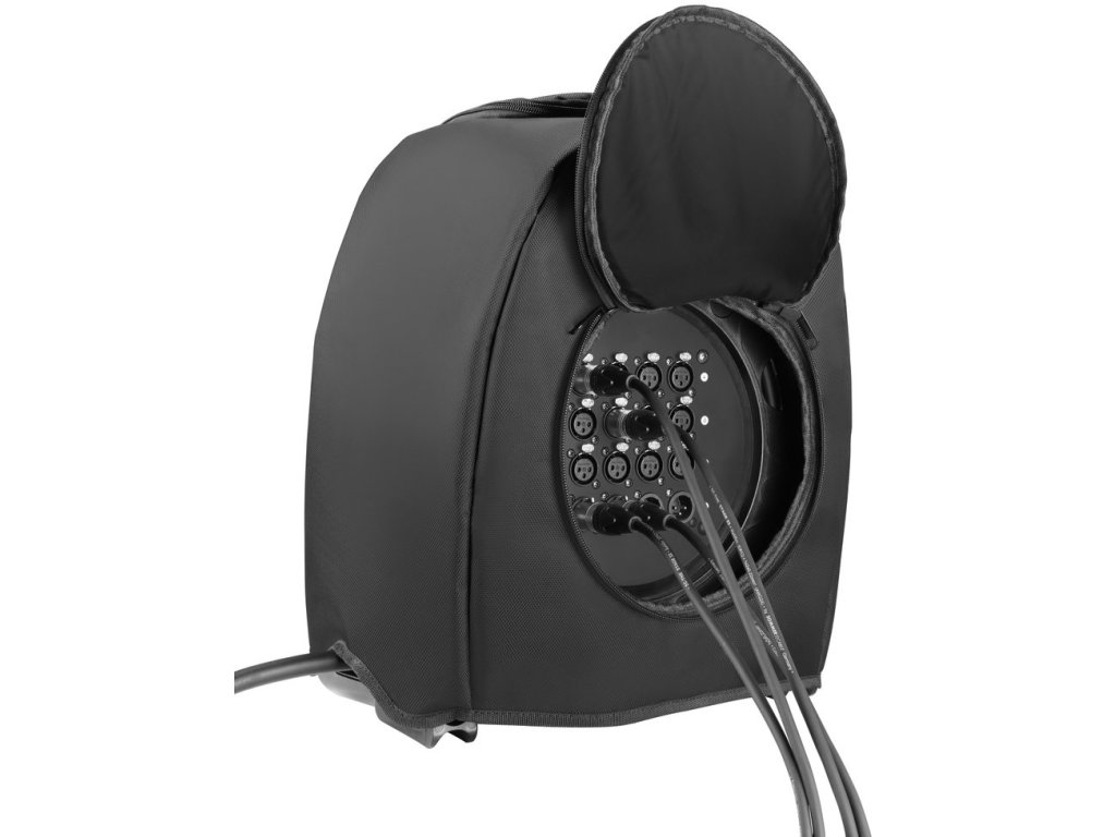 Ten wytrzymały, wodoodporny nylonowy pokrowiec 1680D stanowi doskonałą ochronę bębnów kablowych o wymiarach 400 x 220 x 310 mm podczas użytkowania, transportu i przechowywania. Posiada wyściółkę amortyzującą o grubości 5 mm, wytrzymałe dwukierunkowe zamki błyskawiczne, kieszeń na etykietę i wycięcia na kable po bokach. Wygodna klapka na zamek błyskawiczny umożliwia szybki dostęp do panelu złączy.