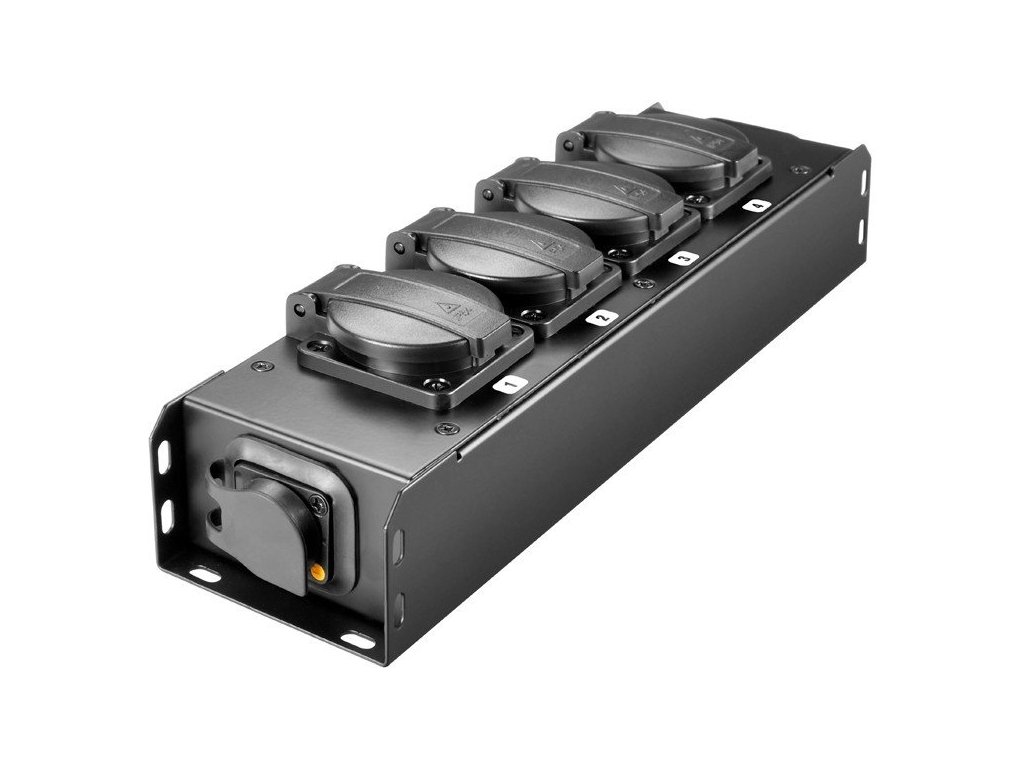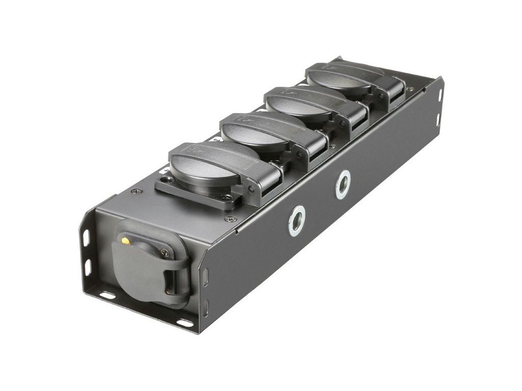 PROPORT 4T to idealna listwa zasilająca do przejrzystej i specyficznej dystrybucji zasilania na scenie, w konstrukcjach kratownicowych itp. Jego solidna metalowa obudowa jest wyposażona w 4 gniazda ze stykami ochronnymi i odchylanymi pokrywkami, czarno-żółte wejście/wyjście do zasilania i przesyłu energii oraz dwie wkładki gwintowane M10 do montażu i trwałej instalacji.