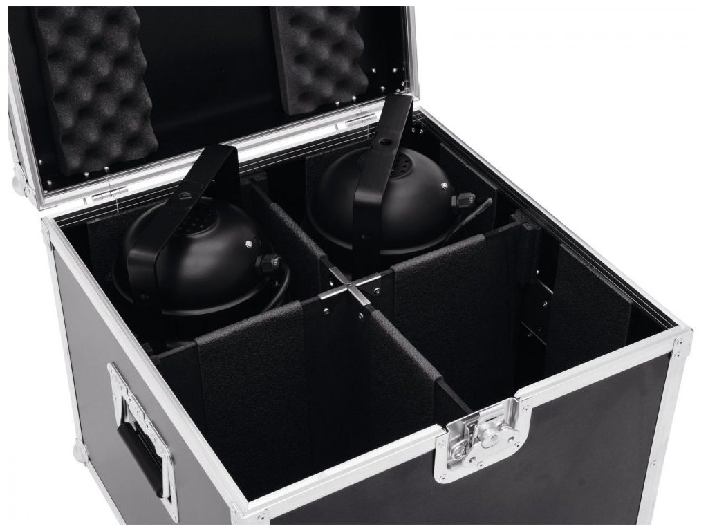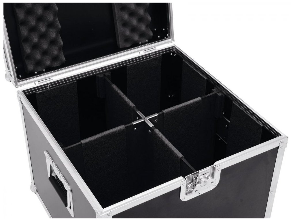 Profesjonalny case transportowy na 4 długie reflektory LED PAR 56. Przestrzeń wewnętrzna jest podzielona na 4 oddzielne sekcje na reflektory. Krzyż dzielący można wyjąć, dzięki czemu case może być używany uniwersalnie również do innego sprzętu i akcesoriów. Wysoka jakość wykonania, wykonana z 7 mm laminowanej sklejki brzozowej w kolorze ciemnobrązowym. Wyściółka z plastazotu, okucia Adam Hall, rama aluminiowa 22 x 1,5 mm, małe kulkowe 3-stronne narożniki, 2 składane uchwyty, zawiasy z ogranicznikiem, 1 zamek motylkowy.