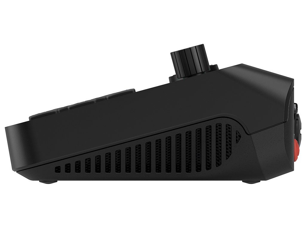 Na panelu przednim znajduje się pięć przycisków przełączania scen, dedykowana sekcja nagrywania, dwa podświetlane enkodery obrotowe, przyciski „AUTO” i „CUT” oraz kolorowy 2" ekran dotykowy do szczegółowych ustawień.