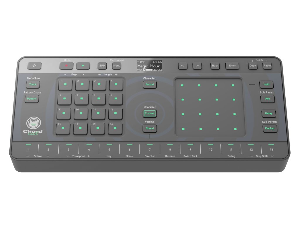 Tryb Chord Cruiser oferuje dziesiątki muzycznie dopasowanych akordów dzięki inteligentnemu algorytmowi, z których możesz łatwo wybrać ten właściwy. Przypisujesz akord do klawisza, a groovebox od razu sugeruje następny – muzyka powstaje naturalnie i bez zakłóceń. Idealny dla producentów, kompozytorów i początkujących.