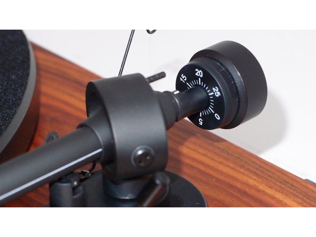 Obracając przeciwwagę, najpierw spróbuj osiągnąć pozycję, w której ramię pozostaje w równowadze (pływa), a grot swobodnie unosi się kilka milimetrów nad powierzchnią płyty LP. Przy delikatnym odchyleniu w górę lub w dół ramię samoczynnie powróci do pierwotnej pozycji. Następnie przytrzymaj metalową część przeciwwagi w ustawionej pozycji, aby nie doszło do jej przekręcenia, i na obrotowej skali ustaw drugą ręką wartość 0 (zero) - pozycja wyjściowa - wyrównaj zero z rysą regulacyjną na tubusie ramienia. Następnie obracając całą przeciwwagę wraz ze skalą, można ustawić żądane wartości nacisku.