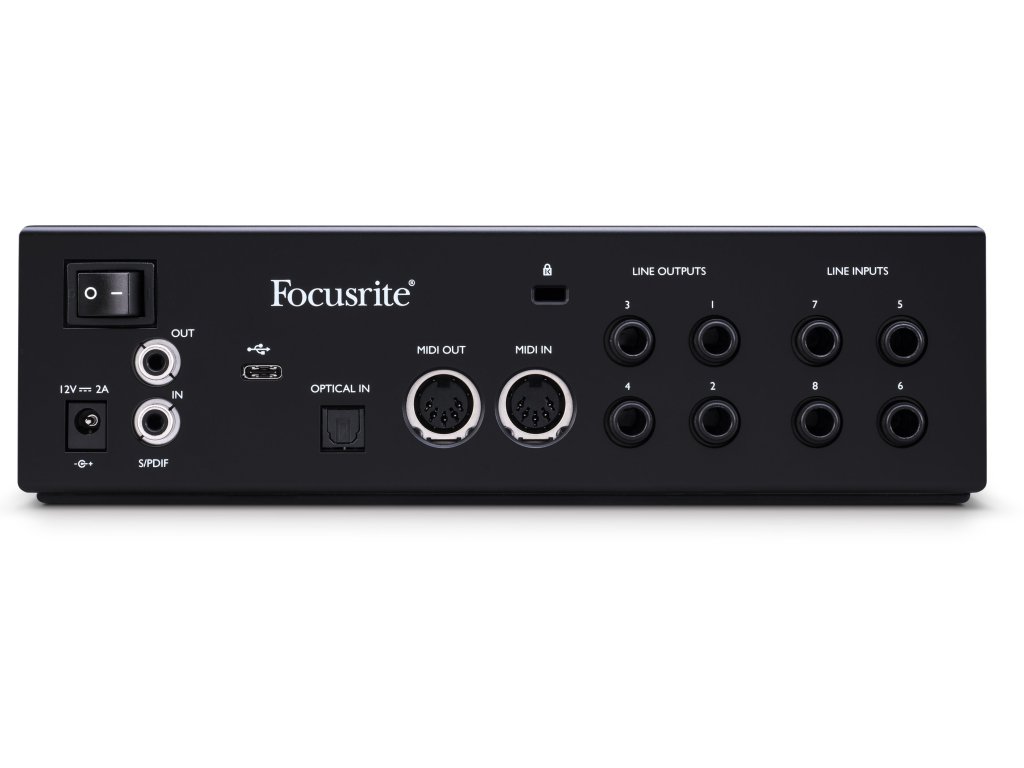 Clarett+ 4 Pre oferuje cztery wejścia combo i cztery wejścia liniowe na tylnym panelu. Interfejs ADAT pomieści dodatkowe 10 wejść, a tylny panel oferuje 4 liniowe wyjścia TRS. Dwa wyjścia słuchawkowe, S/PDIF oraz MIDI In/Out rozszerzają możliwości podłączenia. Nowe USB-C umożliwia bezpośrednie zasilanie bez konieczności podłączania zasilacza DC, jednak zasilacz jest dołączony do zestawu w przypadku podłączenia przez USB 2.0 i nowsze wersje. Wyposażenie uzupełnia para kabli USB oraz pakiet oprogramowania muzycznego, w tym bogata biblioteka dźwięków i sampli.