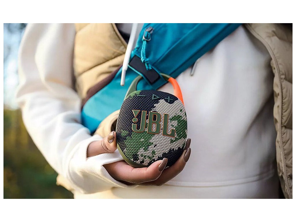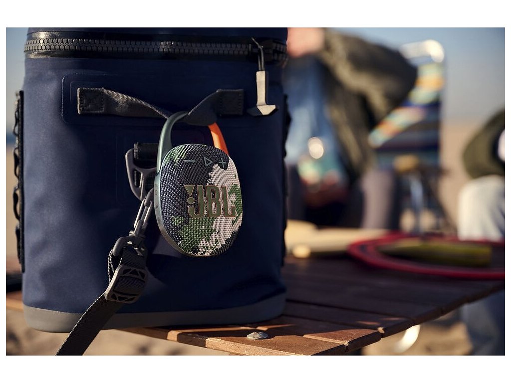 Całkowicie przeprojektowany, w pełni zintegrowany karabińczyk ma znacznie większy otwór dla jeszcze lepszej przenośności. Głośnik JBL Clip 5 można przymocować do wszystkiego, od plecaka po szlufkę paska, dzięki czemu możesz mieć muzykę ze sobą przez cały dzień i gdziekolwiek jesteś.