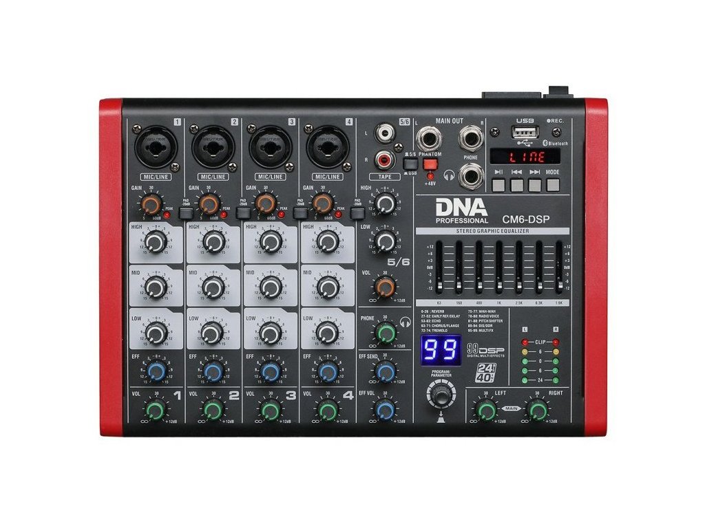 DNA CM6-DSP to kompaktowy 6-kanałowy mikser dźwięku USB z odtwarzaczem MP3 i bezprzewodowym standardem Bluetooth. Urządzenie jest wyposażone w procesor efektów cyfrowych oferujący 99 różnych modulacji dźwiękowych, graficzny equalizer i zasilanie phantom + 48V, dzięki któremu możliwe jest dostarczanie stałego napięcia do niektórych urządzeń audio, instrumentów lub mikrofonów. To świetne rozwiązanie dla wokalistów, zespołów, mobilnych DJ-ów, ale także firm eventowych i różnego typu instytucji.