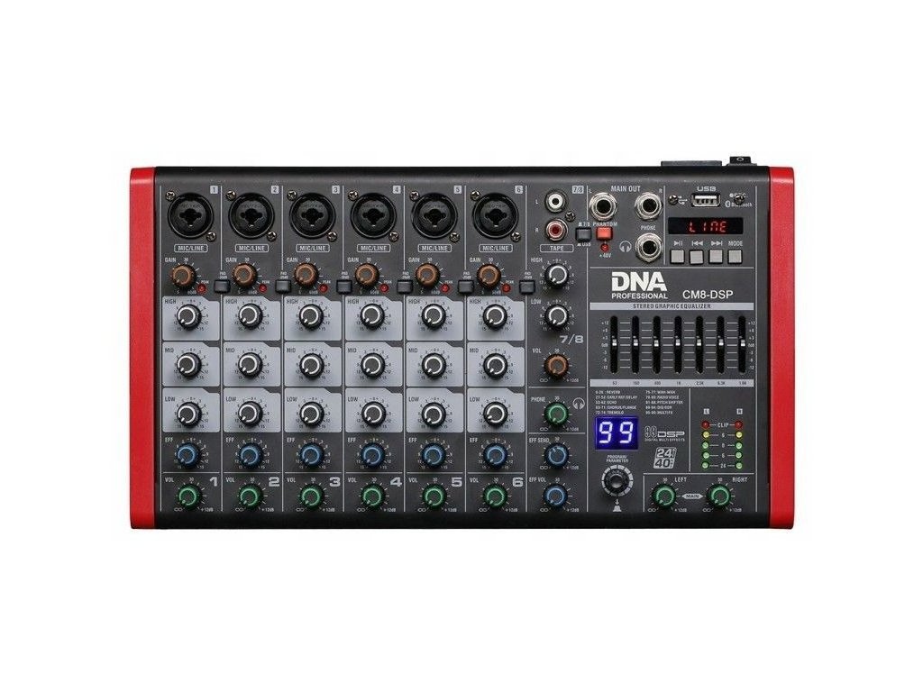 DNA CM8-DSP to kompaktowy 8-kanałowy mikser audio USB z odtwarzaczem MP3 i bezprzewodowym modułem Bluetooth. Jest wyposażony w cyfrowy procesor efektów DSP oferujący 99 różnych modulacji dźwiękowych, graficzny korektor i zasilanie phantom (+48V), dzięki któremu możliwe jest doprowadzanie stałego napięcia do niektórych urządzeń audio, instrumentów lub mikrofonów. To doskonałe rozwiązanie dla wokalistów, zespołów, mobilnych DJ-ów, ale także firm eventowych.