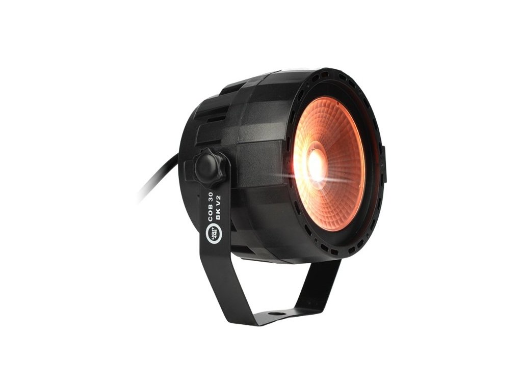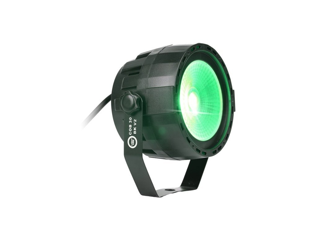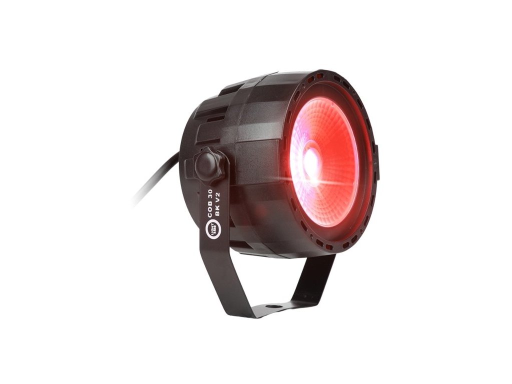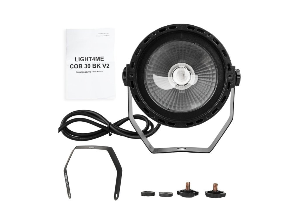 LIGHT4ME COB 30 BK V2 to reflektor par przeznaczony do profesjonalnego oświetlenia scenicznego, który wykorzystuje diodę COB RGB LED o mocy 30 W. Źródło światła składa się z trzech kanałów (czerwony, zielony i niebieski), co umożliwia szeroką gamę kombinacji kolorów i efektów. Kąt świecenia 35° zapewnia równomierne rozłożenie światła w przestrzeni, co czyni go odpowiednim do zastosowania w różnych środowiskach, w tym na małych i średnich scenach, w klubach i salach weselnych.