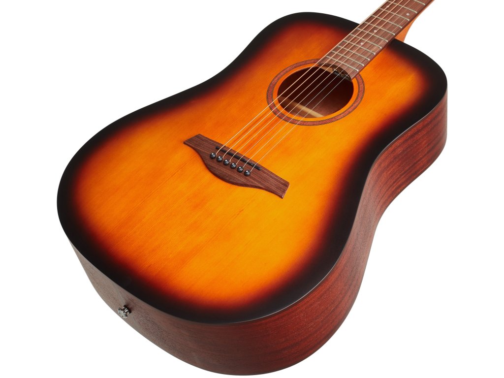 Gitara akustyczna CODY DN-SBT oferuje płytę wierzchnią ze sklejki świerkowej, płytę tylną i boki ze sklejki sapele, gryf z okoumé o przyjemnym profilu C, orzechową podstrunnicę z dwudziestoma progami, orzechowy mostek, chromowane, odlewane maszynki do strojenia oraz wykończenie open-pore sunburst satin.