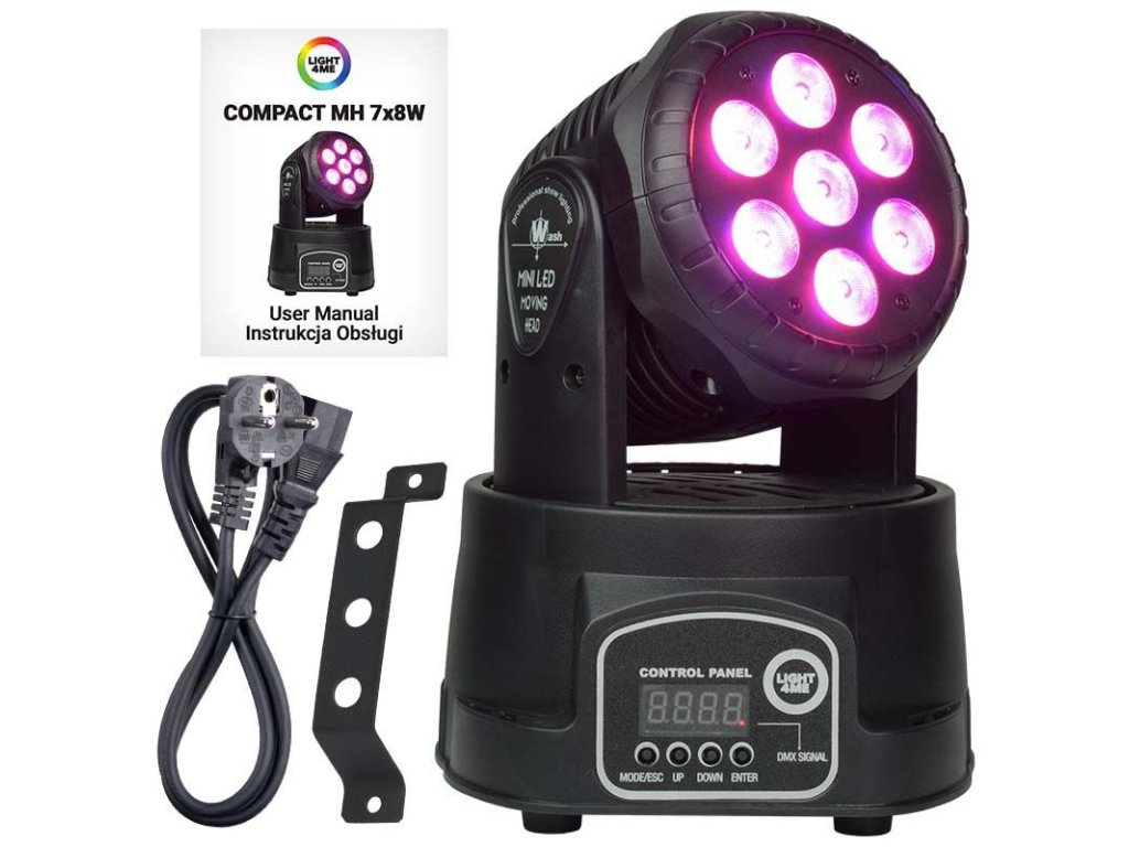 Reflektor punktowy Light4Me Compact MH 7x8W to nowoczesna i kompaktowa głowica ruchoma LED Wash. Urządzenie jest wyposażone w 7 diod o mocy 8 watów w palecie RGBW. Małe wymiary i szeroki zakres ruchów głowicy LED ułatwiają oświetlenie małej sceny, parkietu tanecznego, zespołu lub stanowiska DJ-a reflektorem, a także oświetlenie wnętrza i przygotowanie dekoracji światłem.