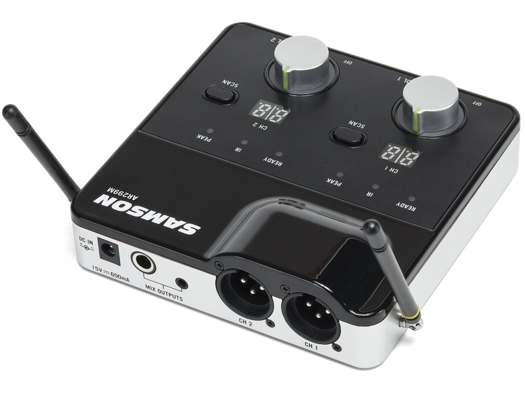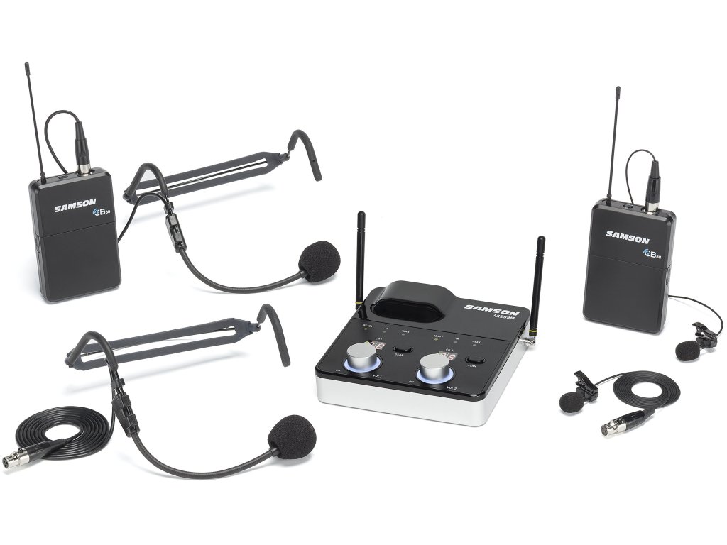 2-kanałowy system premium UHF z dwoma mikrofonami nagłownymi i przypinanymi oraz nowoczesnym odbiornikiem z funkcją skanowania otoczenia.