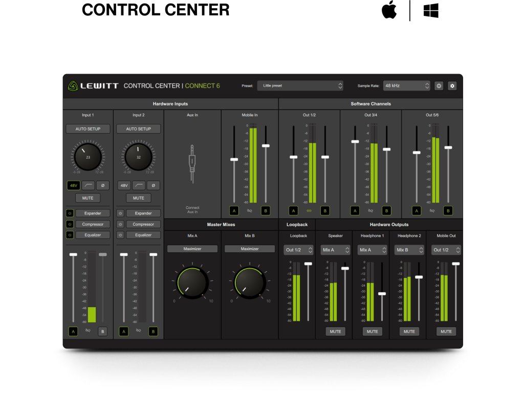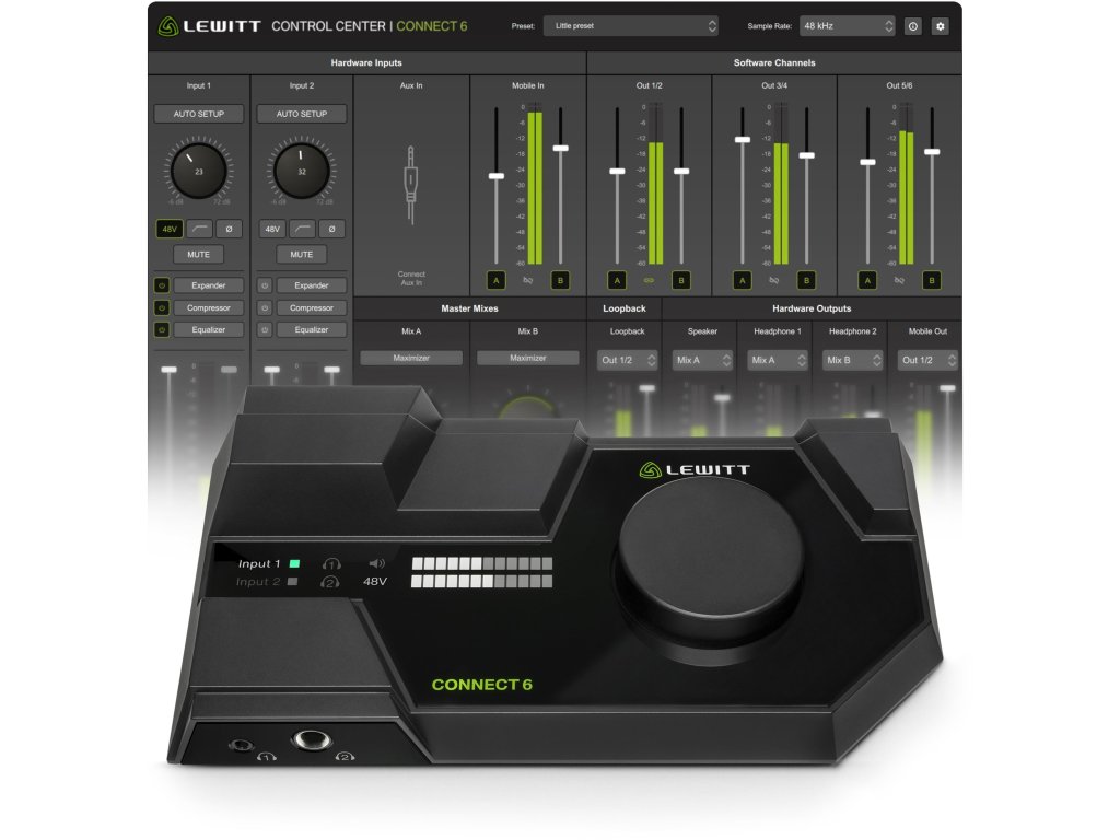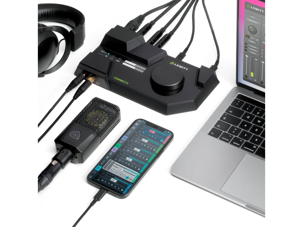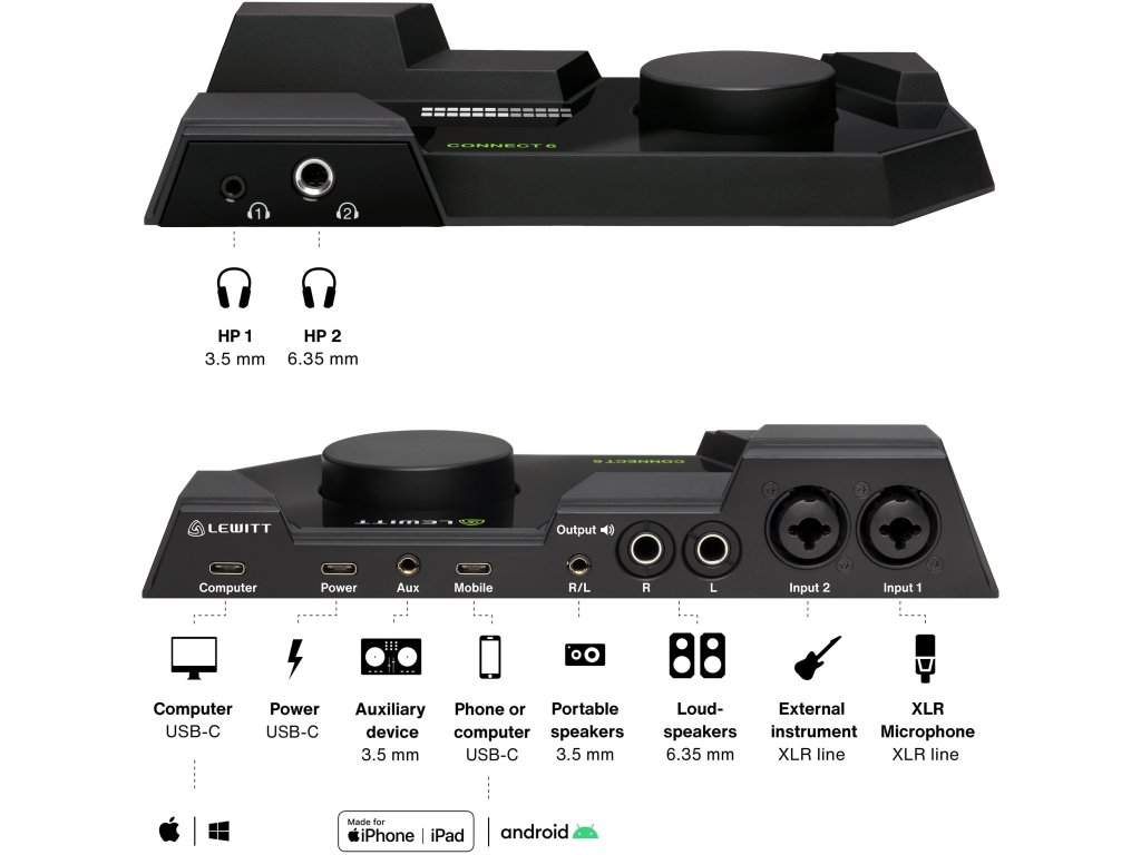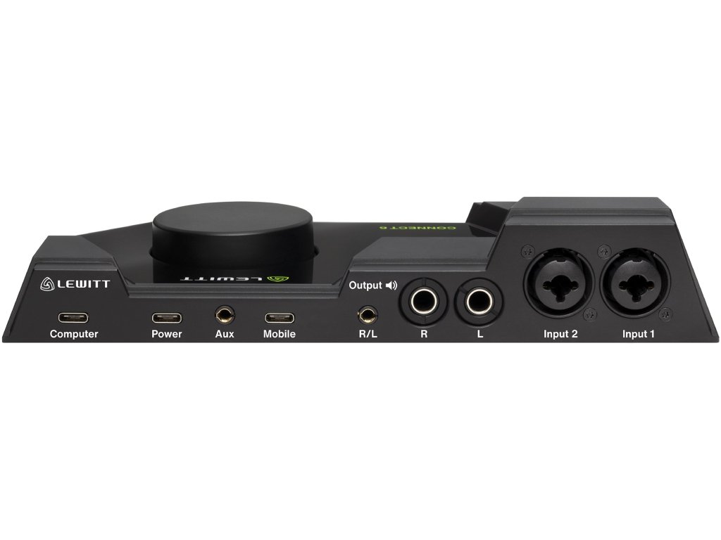 LEWITT Connect 6 to wszechstronna karta dźwiękowa USB, idealna do nagrywania, streamowania lub produkcji muzycznej. Wyposażona jest w funkcję DSP zapewniającą najwyższą jakość dźwięku i zerową latencję. Do nagrywania głosu lub instrumentu służą dwa wejścia XLR / JACK wyposażone w bardzo mocny przedwzmacniacz. Jednocześnie dysponuje imponującą liczbą wszystkich wejść, których możesz potrzebować, w tym na przykład wejściem zasilania USB-C dla twoich urządzeń zewnętrznych. Oprócz niego z tyłu znajdziesz również dwa dodatkowe USB-C: jeden do połączenia z komputerem, drugi do połączenia z telefonem. W połączeniu z wyjściami na głośniki i wejściem 3,5 mm dla urządzeń zewnętrznych otrzymujesz naprawdę uniwersalne urządzenie.