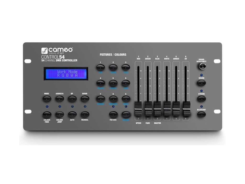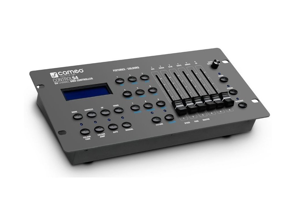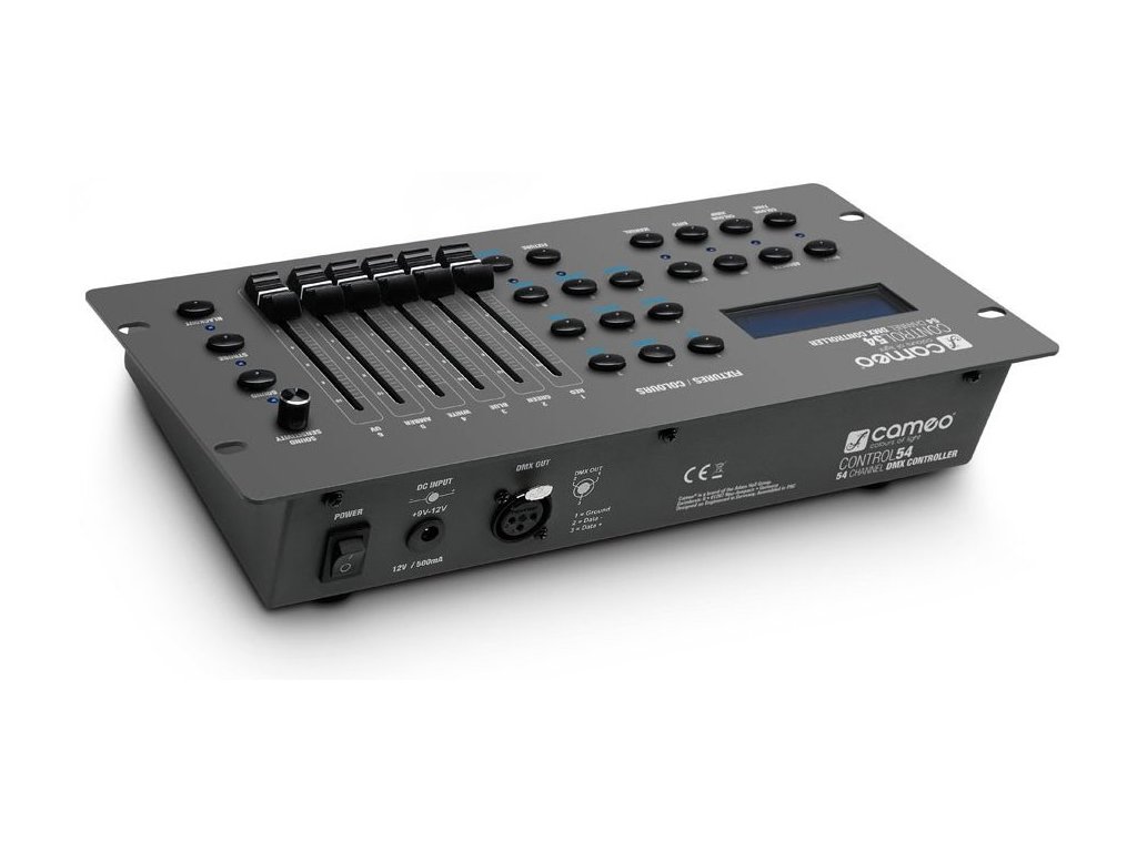 Control 54 to kompaktowy stół oświetleniowy DMX, który obsługuje do 9 opraw lub grup opraw. Uniwersalna konsola zapewnia łatwą i intuicyjną obsługę i jest idealnym wyborem dla DJ-ów, klubów nocnych, salonów i barów. Zawiera 9 kolorowych ustawień wstępnych z przyciskami szybkiego dostępu, które działają jako przełączniki urządzeń oraz 6 faderów do indywidualnego sterowania intensywnością czerwieni, zieleni, niebieskiego, białego, bursztynowego i UV.
