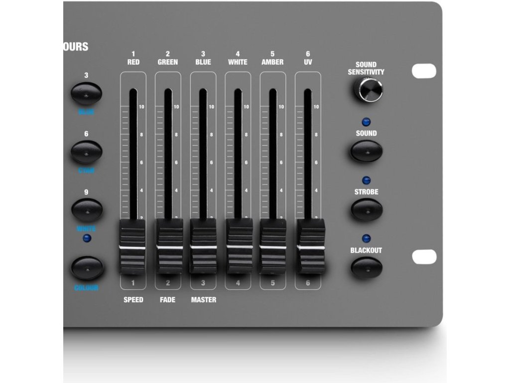 Wiele przycisków funkcyjnych umożliwia bezpośredni dostęp do aktywacji dźwiękiem z regulowaną czułością mikrofonu, strobo, zaciemnienia, zanikania kolorów, skoku kolorów, trybu automatycznego lub ręcznego, a wyświetlacz LC wygodnie wyświetla aktualną funkcję i parametry.
