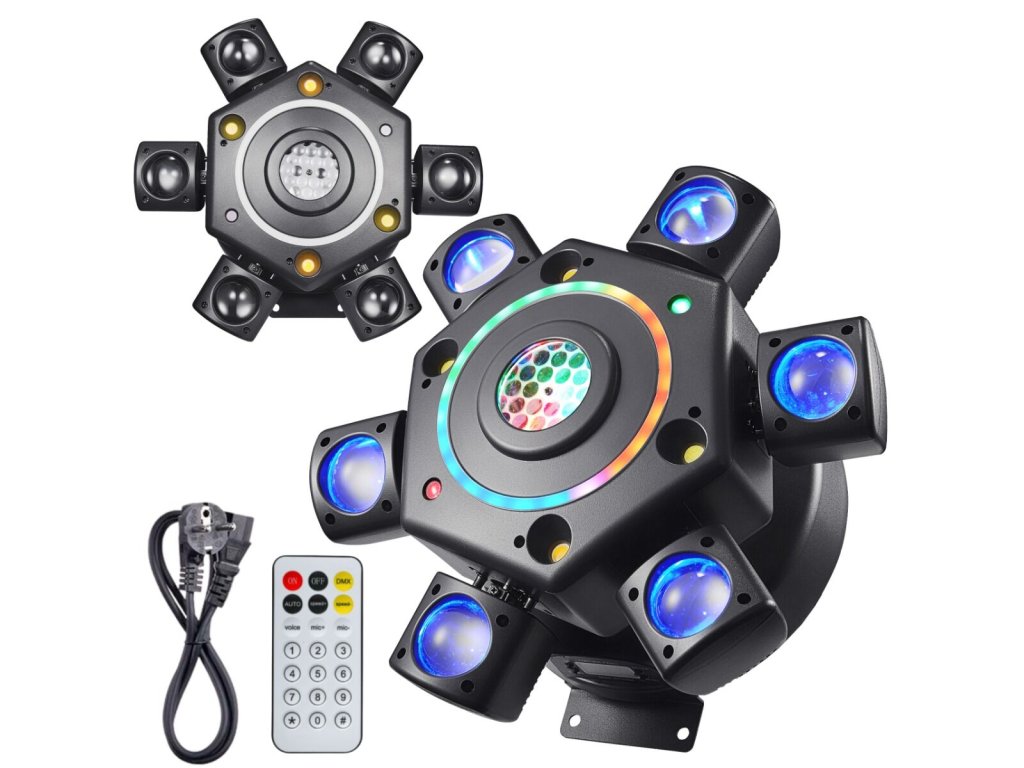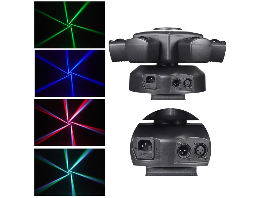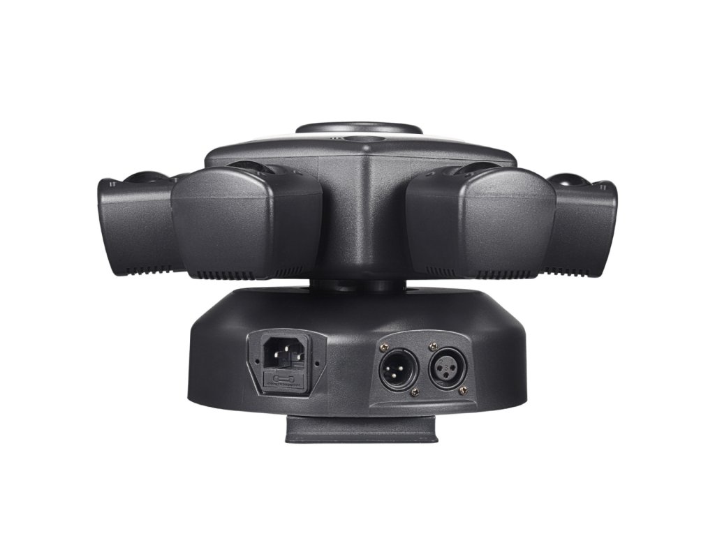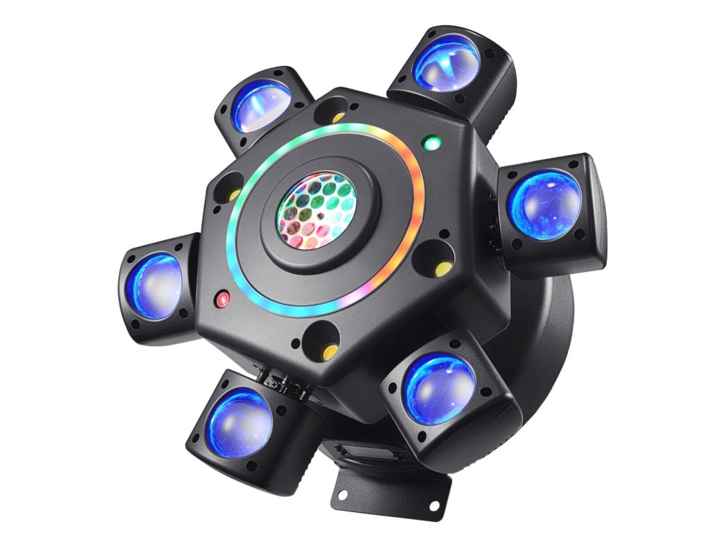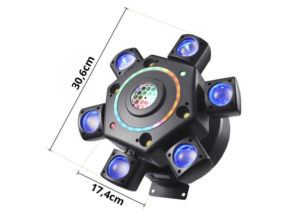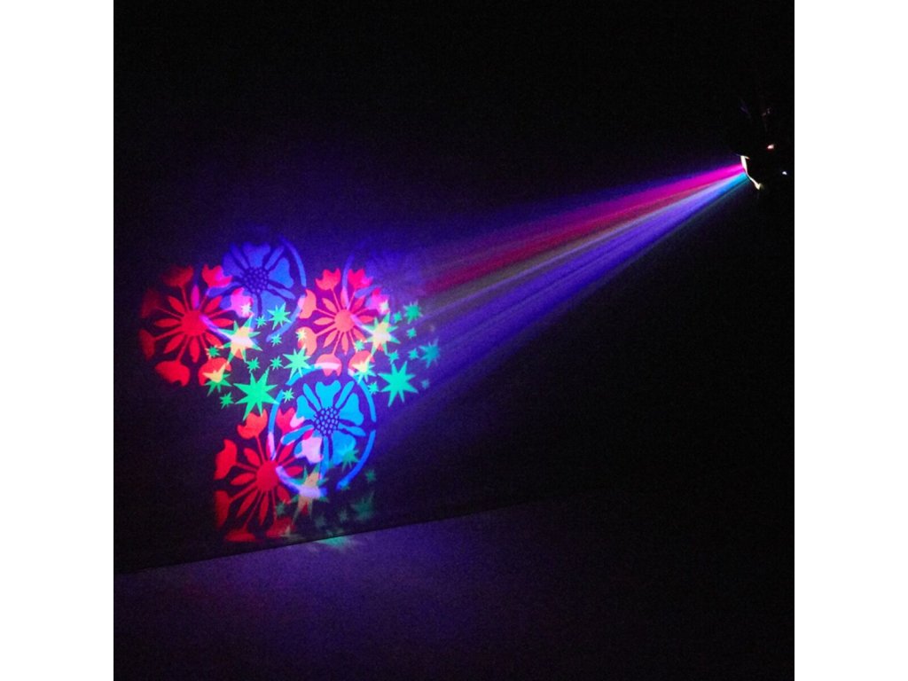 - Efekt Kaleido/Gobo: 6x3W 4-w-1 LED RGBW (3x3W kaleido, 3x3W gobo), regulowana prędkość obrotowa silnika, 4 wzory gobo