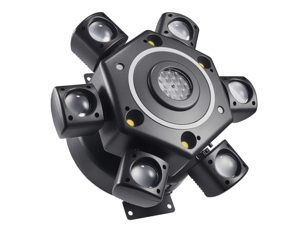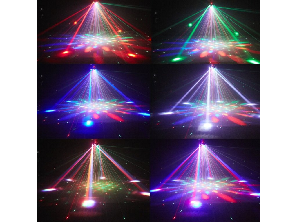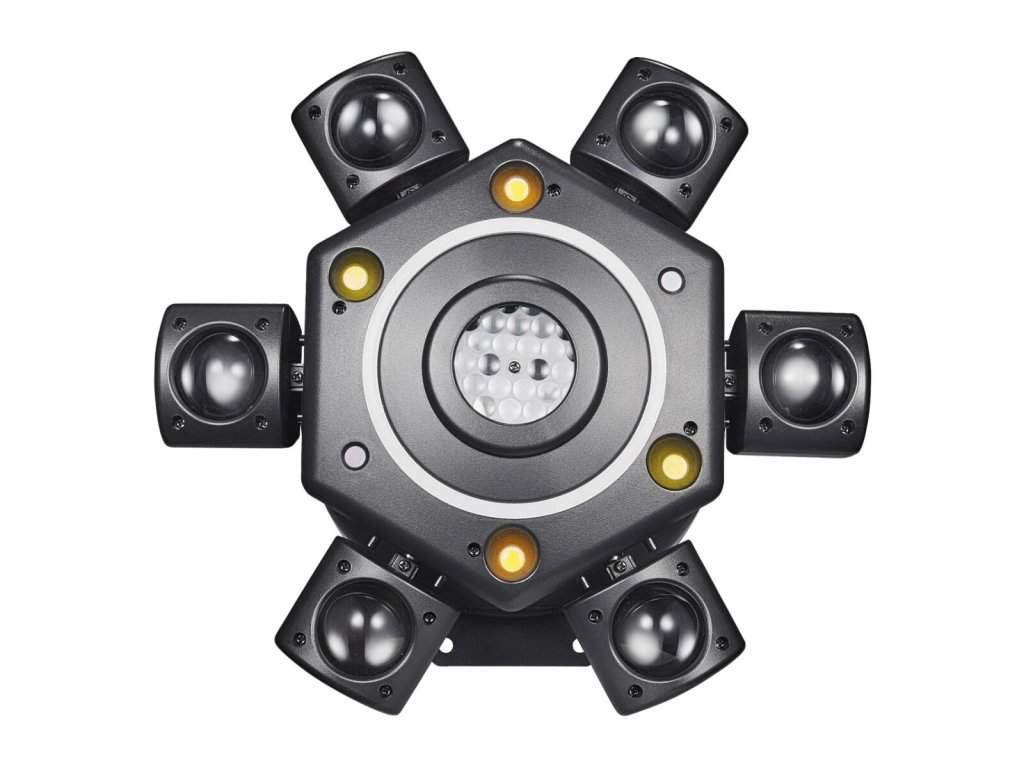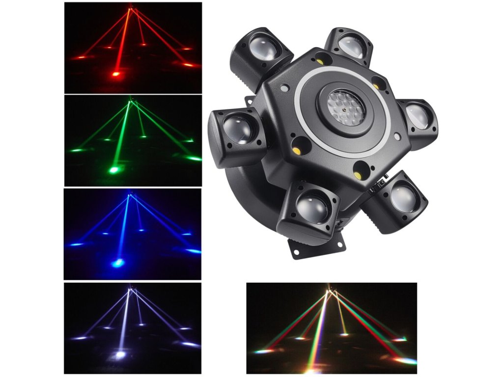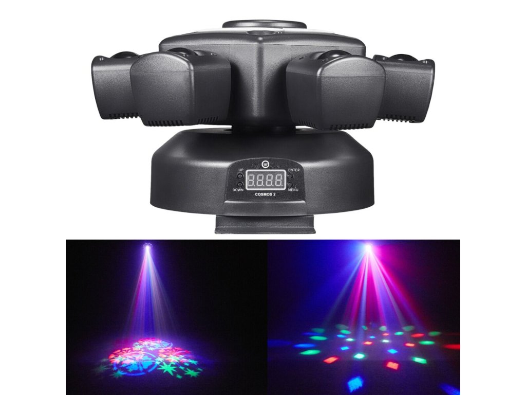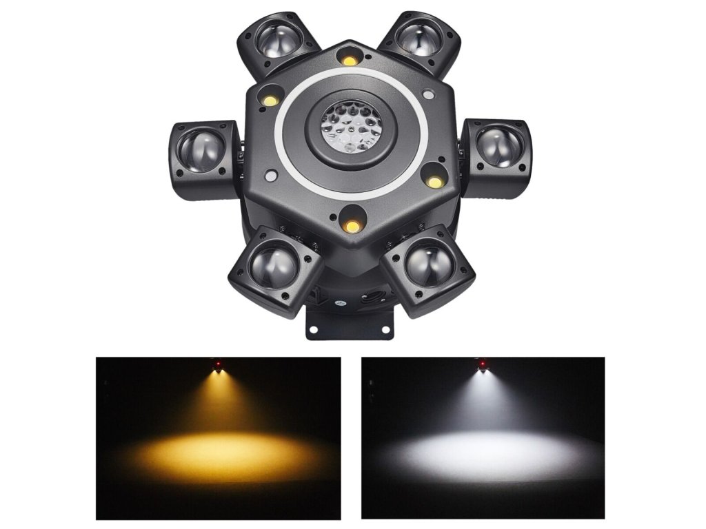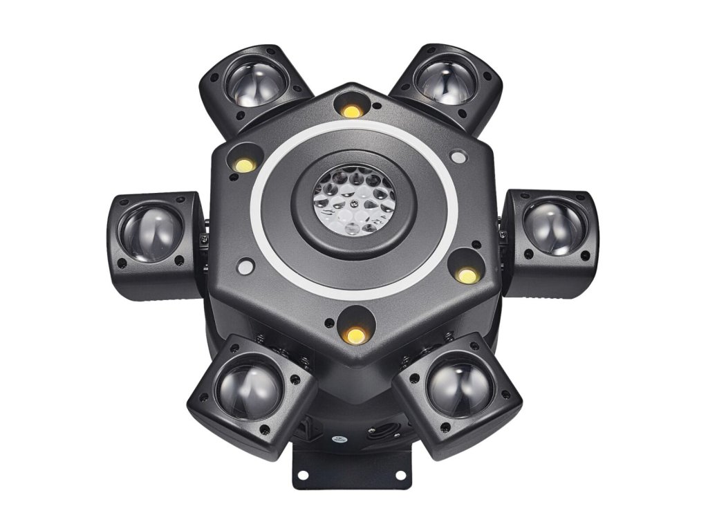 - Efekt Kaleido/Gobo: 6x3W 4-w-1 LED RGBW (3x3W kaleido, 3x3W gobo), regulowana prędkość obrotowa silnika, 4 wzory gobo