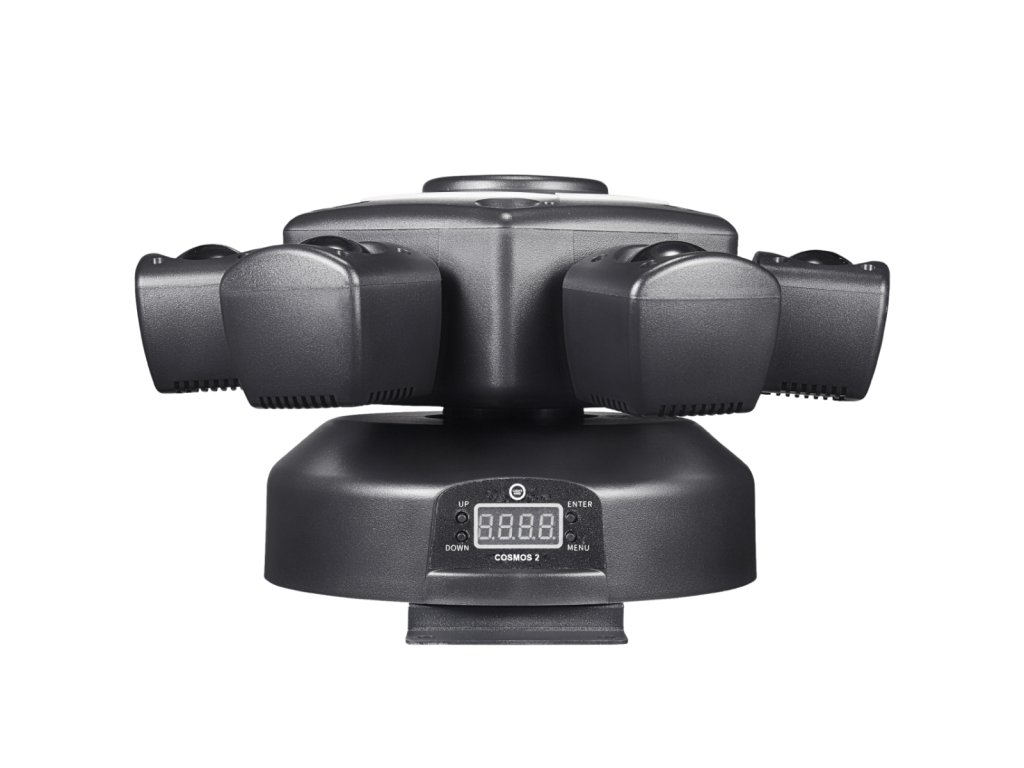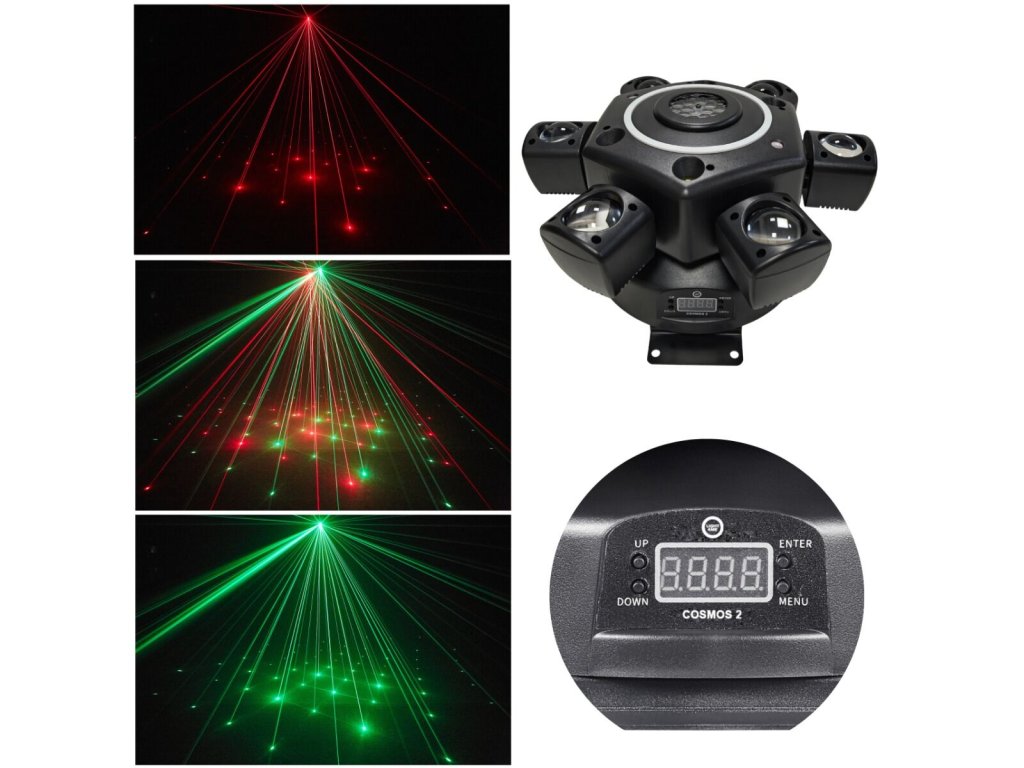 Light4Me Cosmos 2 oferuje efekty strumieniowe, kalejdo/gobo, pierścieniowe, stroboskopowe biało-złote oraz lasery R/G, które można dowolnie łączyć. Pozwoli Ci to stworzyć niepowtarzalne widowisko świetlne, dopasowane do atmosfery wydarzenia. Urządzenie obsługuje tryb automatyczny, DMX, master/slave i dźwiękowy, a także może być sterowane za pomocą bezprzewodowego pilota na podczerwień lub intuicyjnego panelu sterowania składającego się z wyświetlacza LED i 4 przycisków. Daje Ci to całkowitą swobodę sterowania – od szybkiego uruchomienia po zaawansowane programowanie.