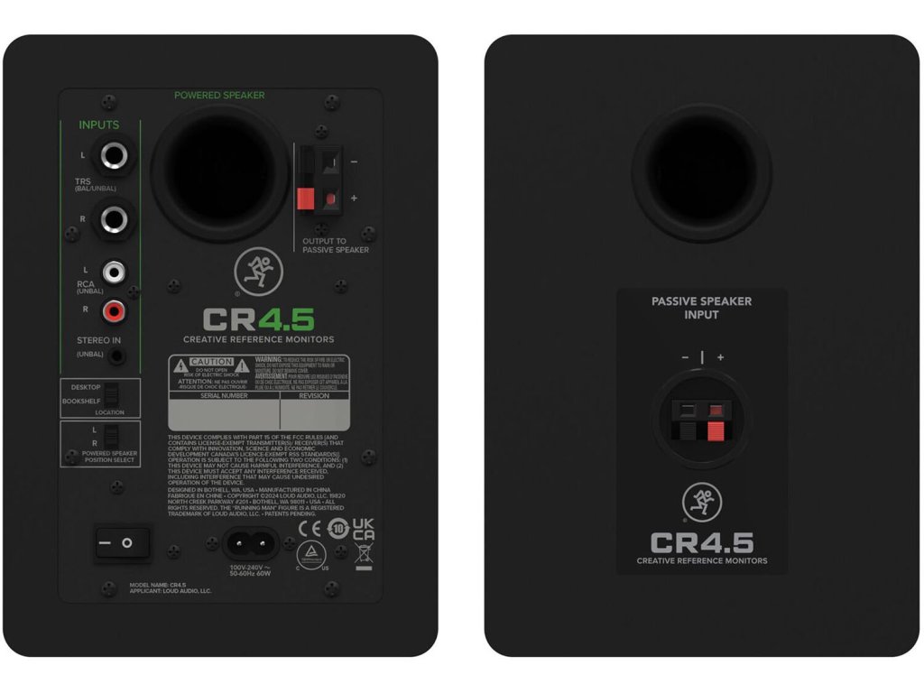 Mackie CR4.5 są zawsze sprzedawane w parach, gdzie jeden z monitorów służy jako master, zawiera elementy sterujące i wzmacniacz, a drugi podłączasz kablem głośnikowym, który jest częścią zestawu. Monitory posiadają symetryczne wejścia TRS, niesymetryczne RCA, a także wejście stereo do szybkiego podłączenia telefonu lub notebooka.