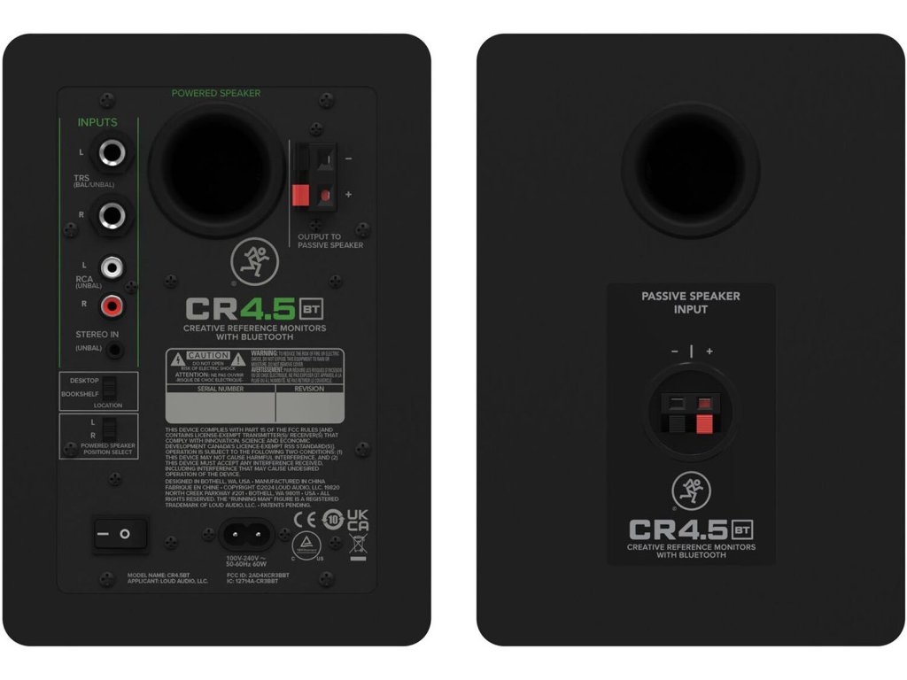 Mackie CR4.5 są zawsze sprzedawane w parach, gdzie jeden z monitorów służy jako master, zawiera elementy sterujące i wzmacniacz, a drugi podłączasz kablem głośnikowym, który jest częścią zestawu. Monitory posiadają symetryczne wejścia TRS, niesymetryczne RCA, a także wejście stereo do szybkiego podłączenia telefonu lub notebooka. Dodatkowo ten model posiada wbudowany odbiornik Bluetooth do bezprzewodowego przesyłania muzyki bezpośrednio ze smartfona lub tabletu.